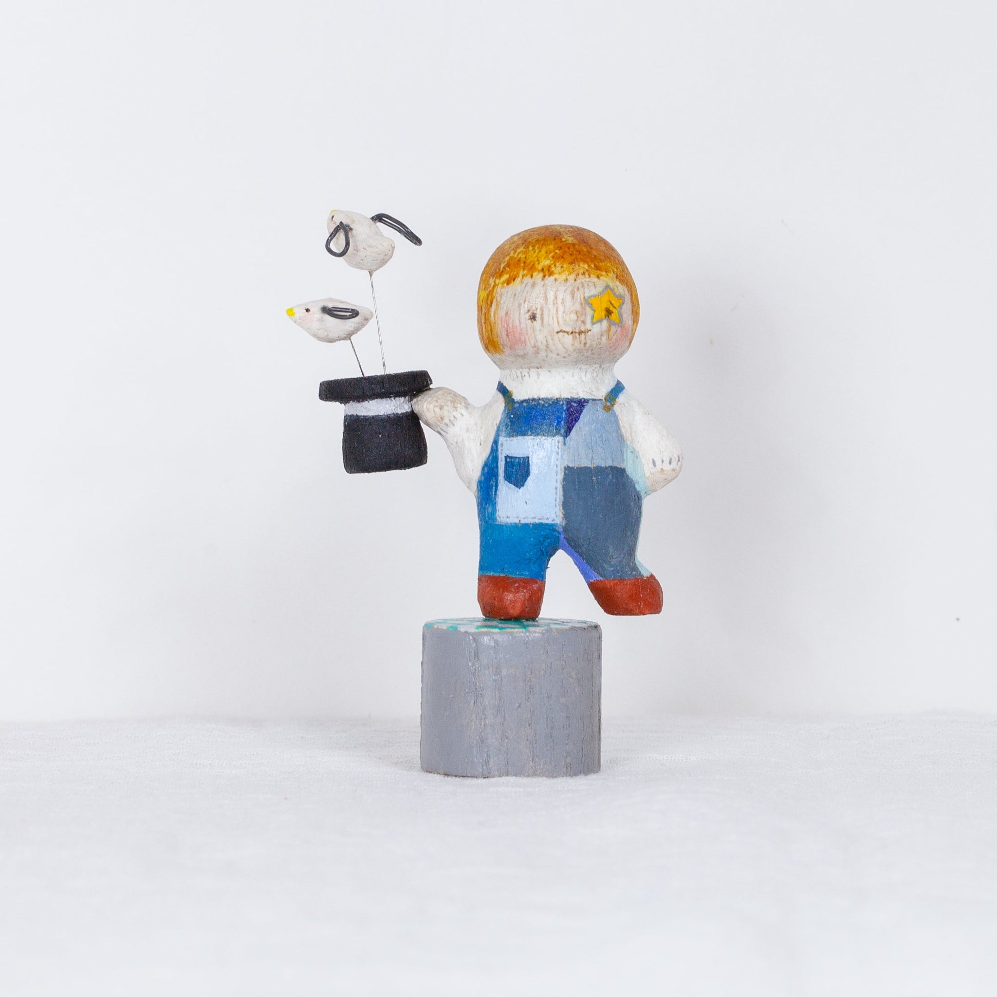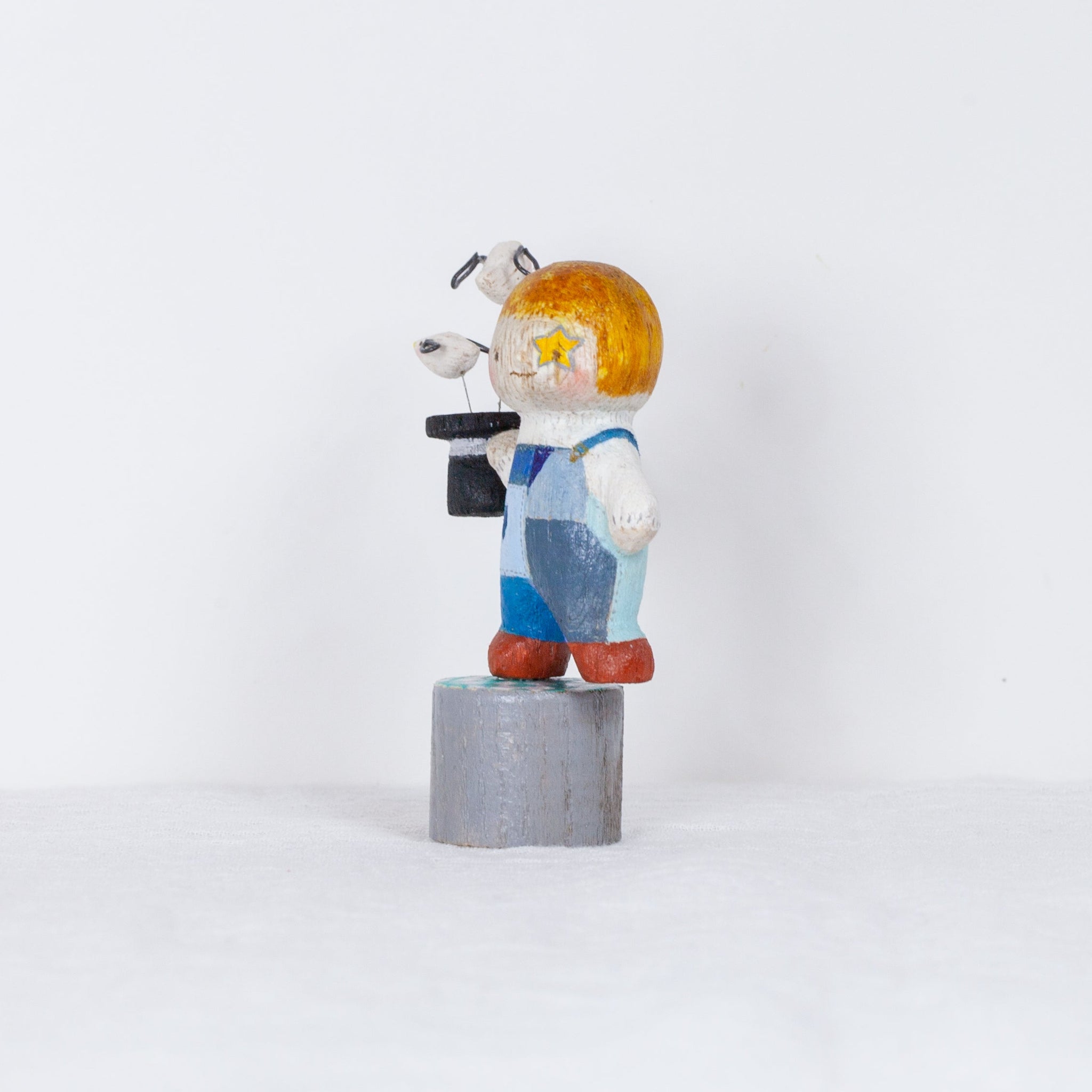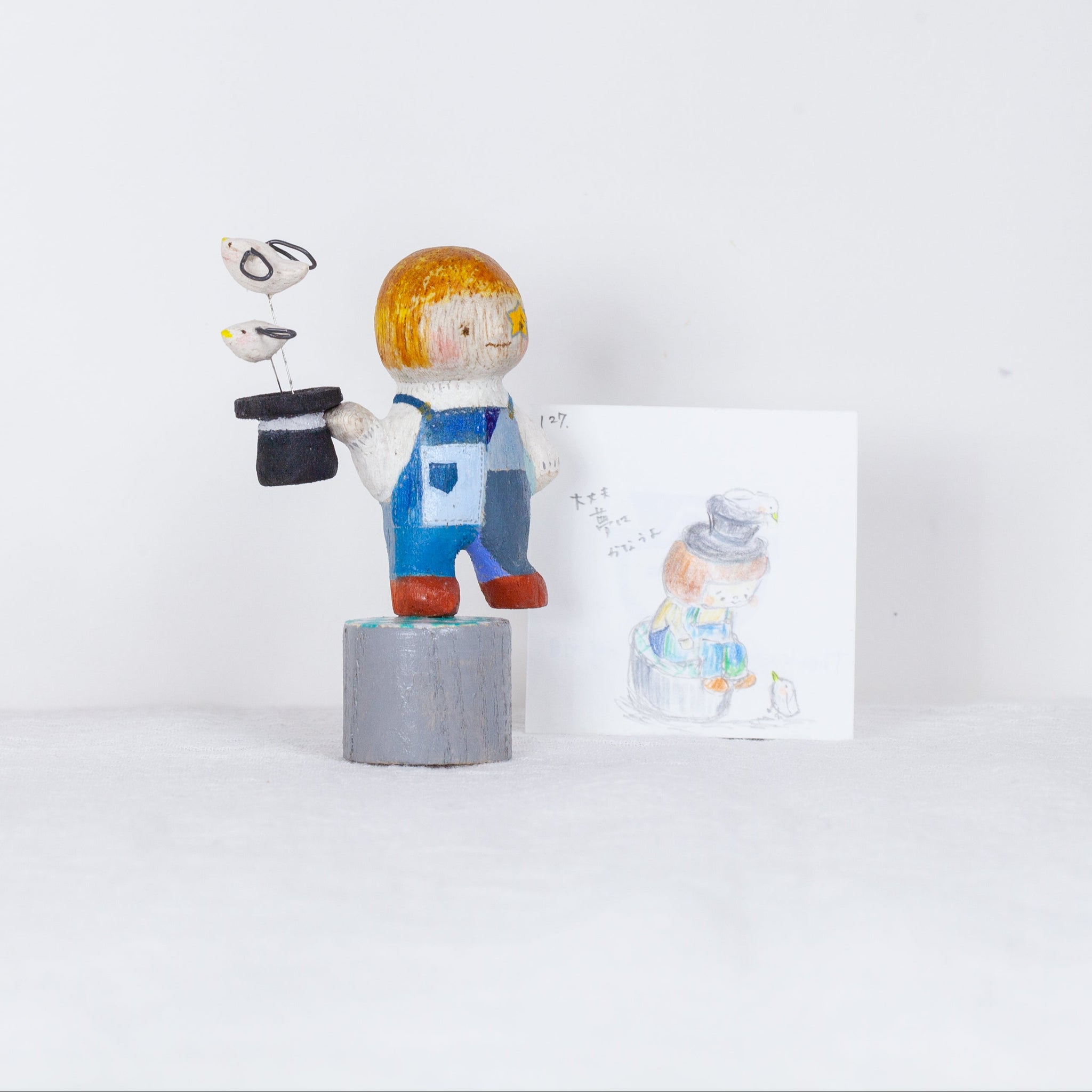 Akaiboushinoki’s carvings often feature tiny characters who always look just a little bit concerned. Each one is hand carved, hand painted, and completely one-of-a-kind. But it is not just the carvings that make Akaiboushinoki’s work special. The playful titles and little after stories, illustrated scenes that come with each piece, feel like quiet whispers from the figurines themselves and have become a signature part of Akaiboushinoki’s world.