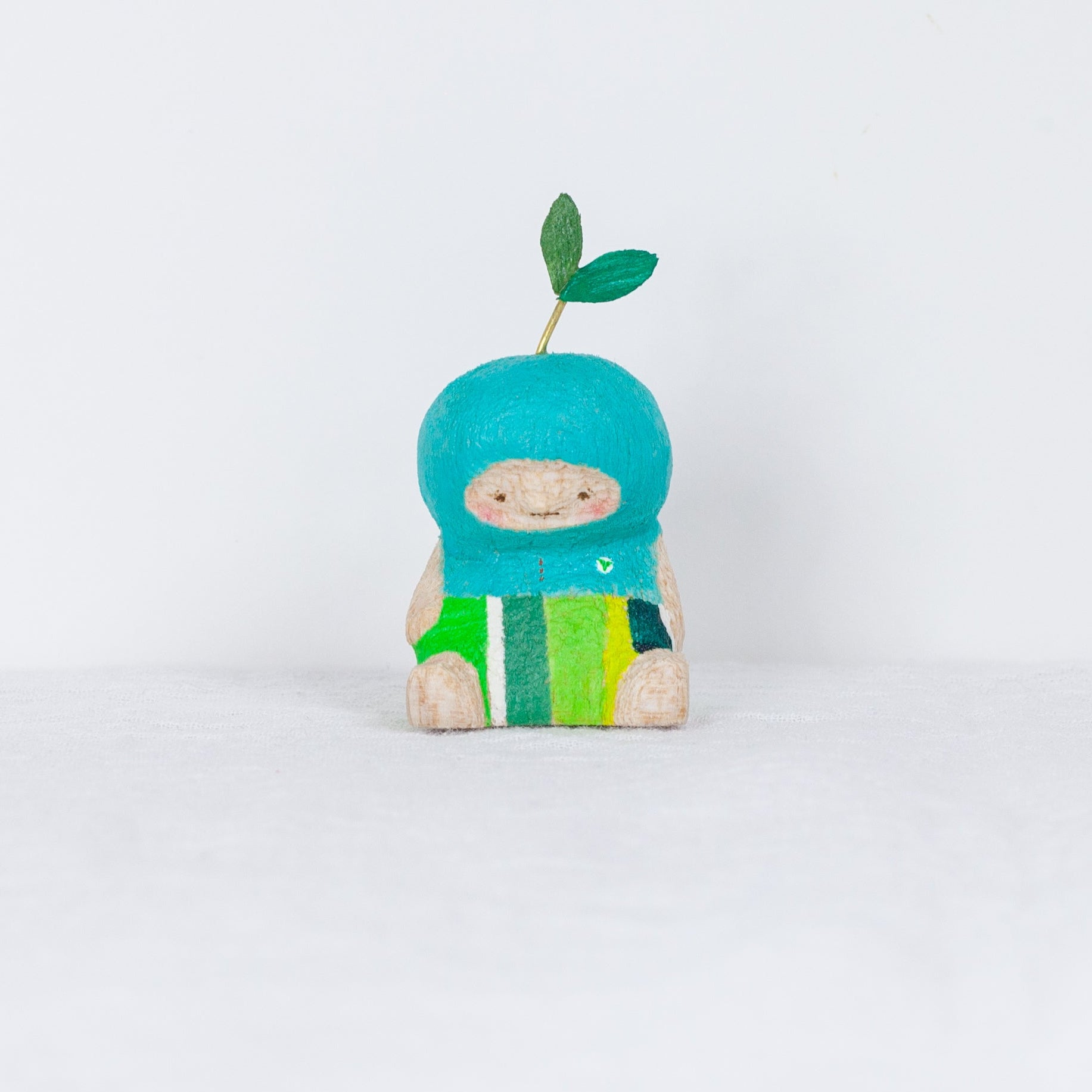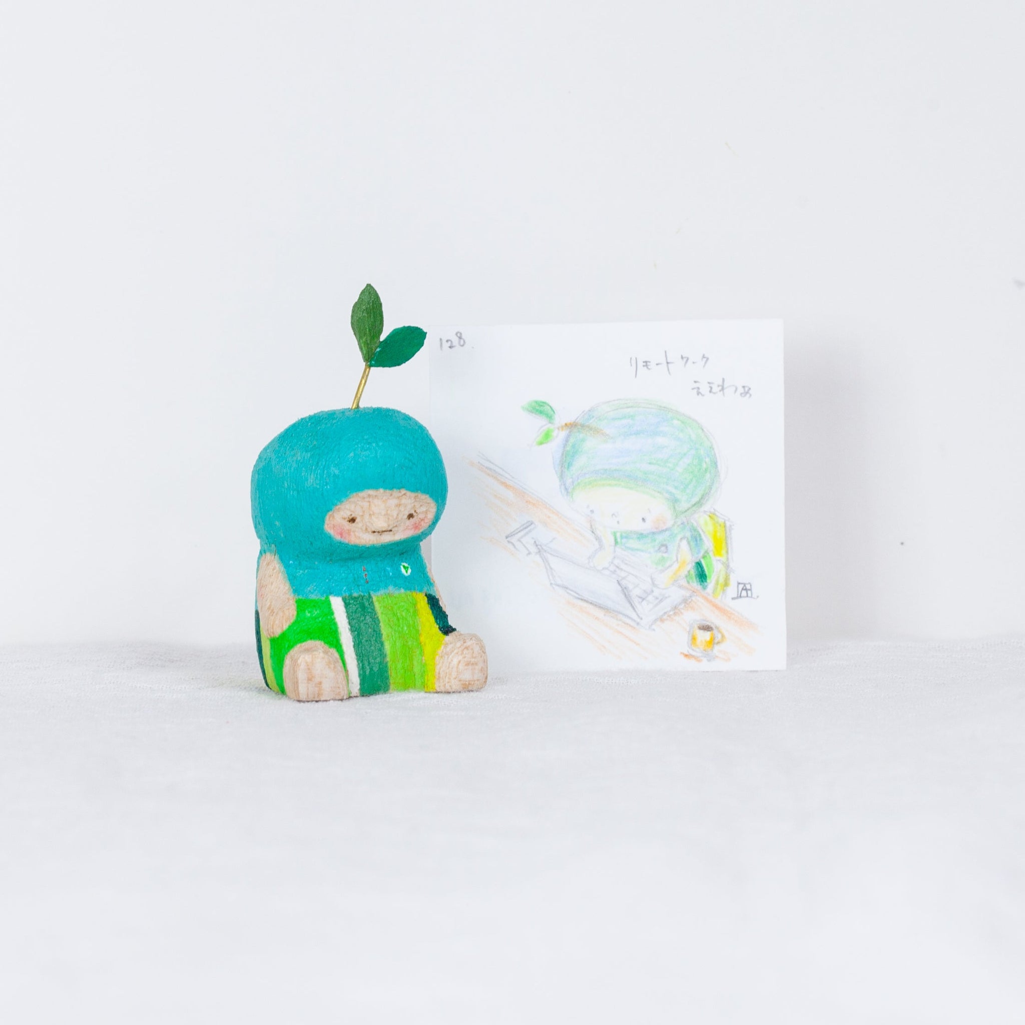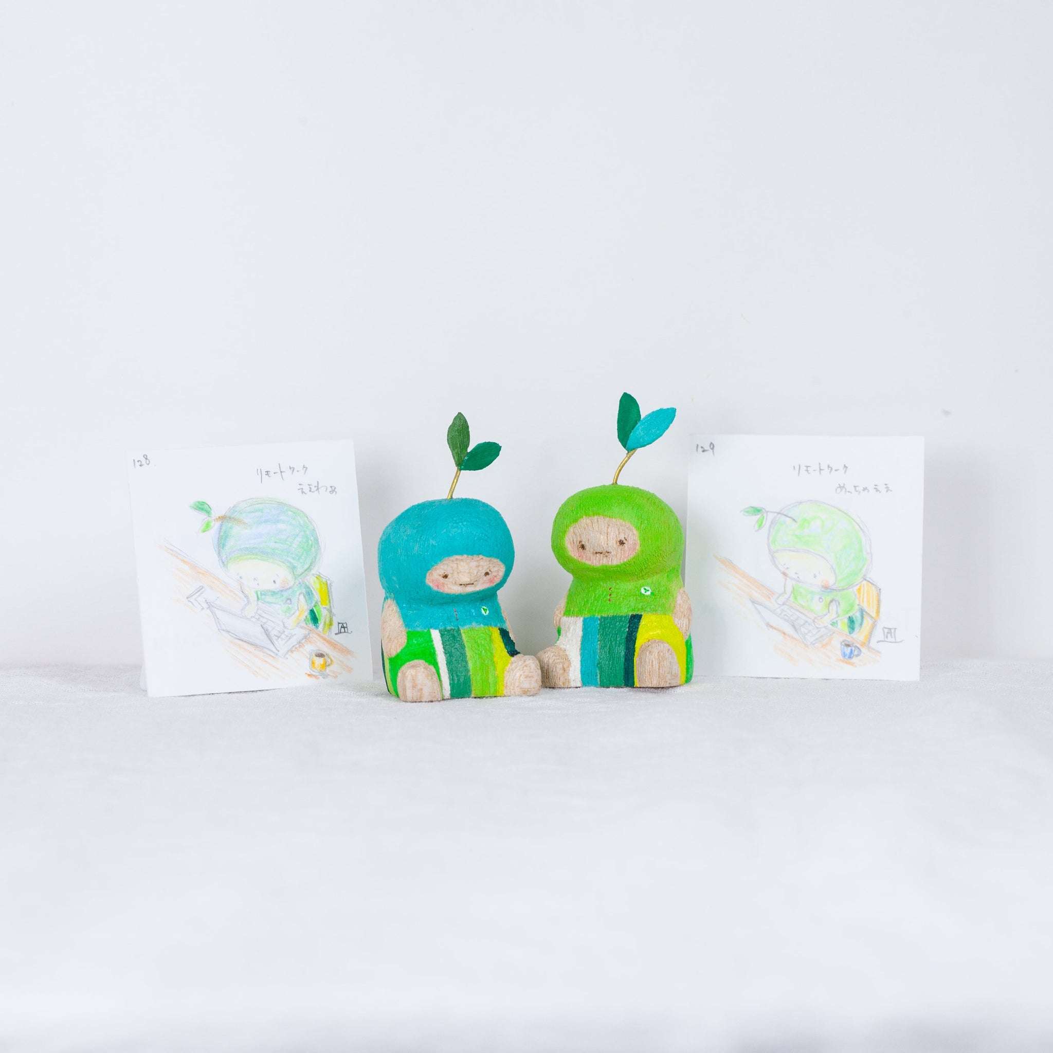 Akaiboushinoki’s carvings often feature tiny characters who always look just a little bit concerned. Each one is hand carved, hand painted, and completely one-of-a-kind. But it is not just the carvings that make Akaiboushinoki’s work special. The playful titles and little after stories, illustrated scenes that come with each piece, feel like quiet whispers from the figurines themselves and have become a signature part of Akaiboushinoki’s world.