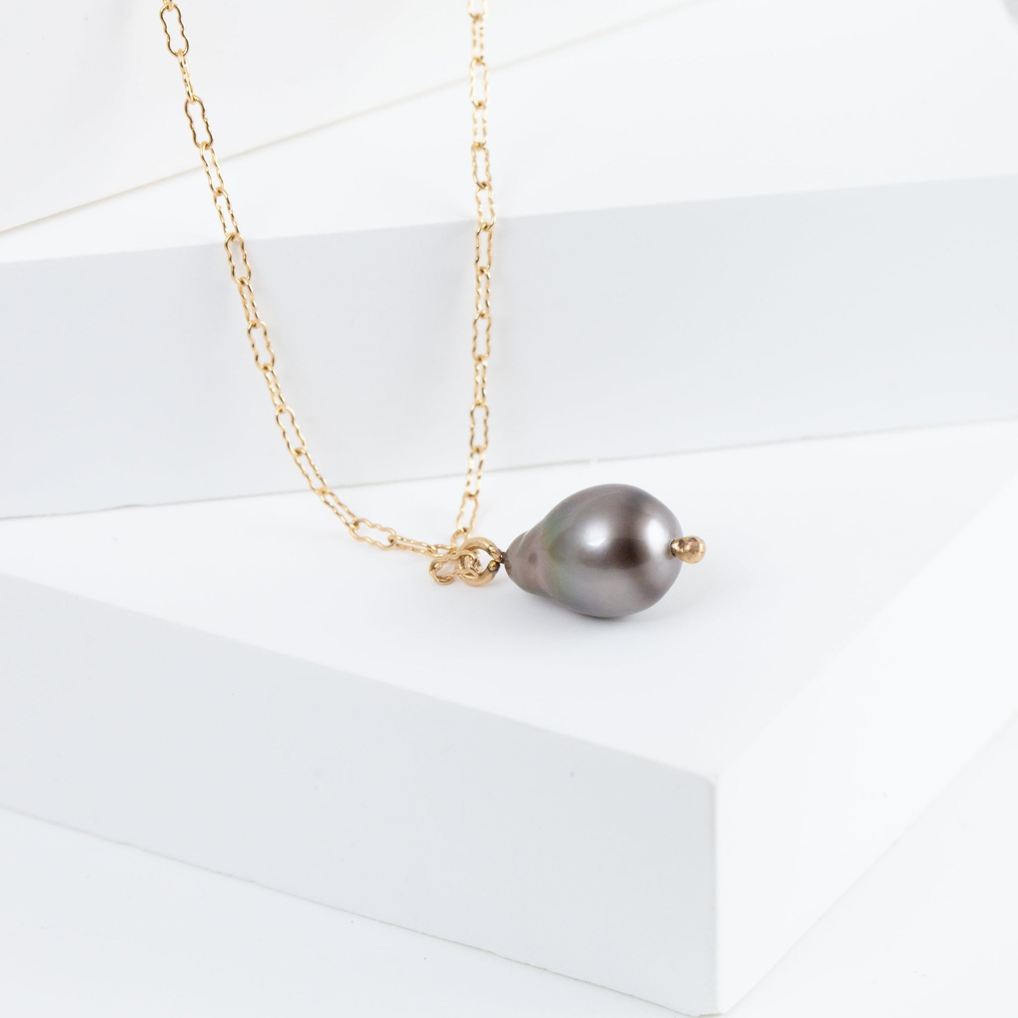 14K yellow gold necklace with an one-of-a-kind Tahitian pearl. Inspired by the nature, occasionally sweet pieces are often in organic shapes.