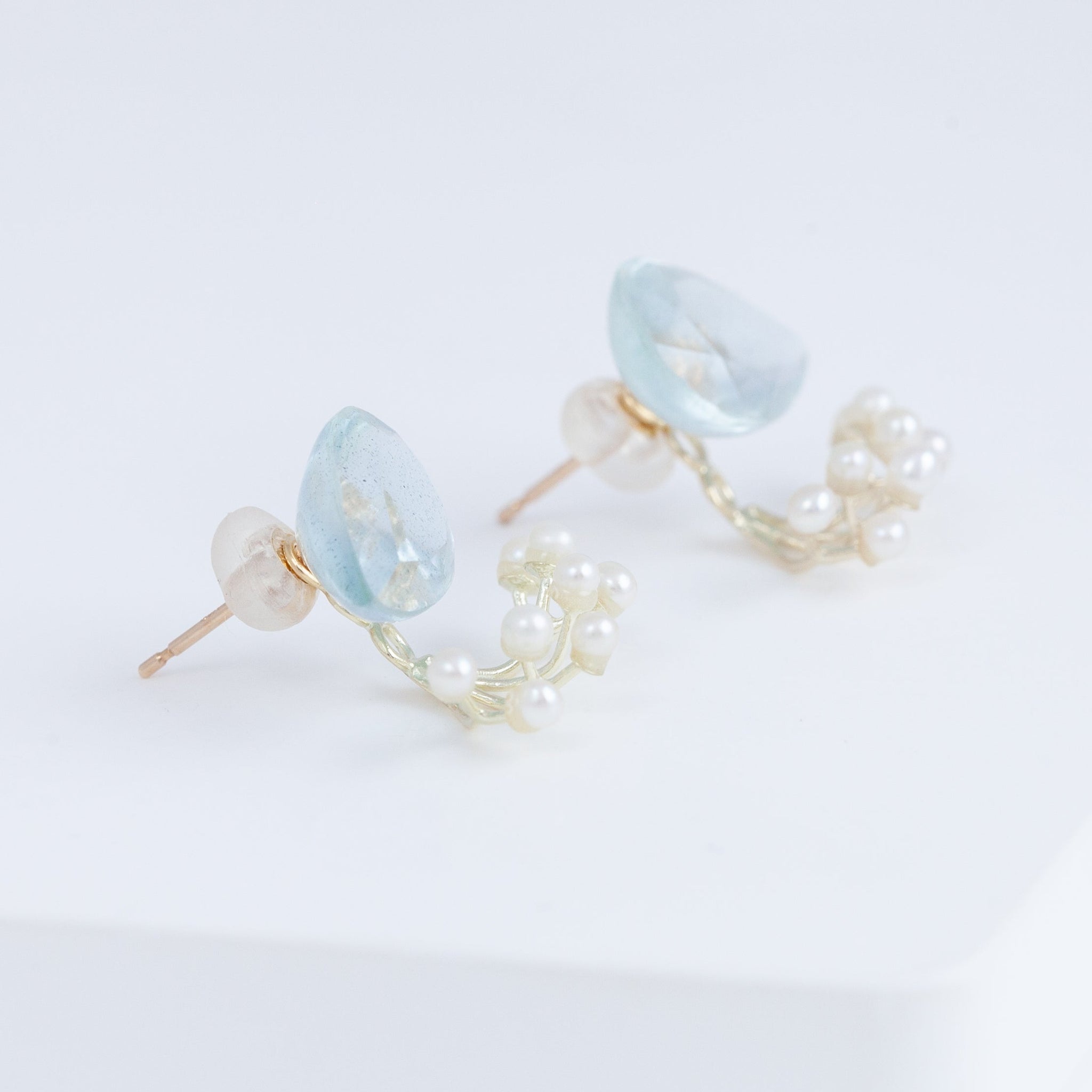 Bohem's signature fairy earrings with a pear shaped aquamarine as the main stone, and freshwater pearls on the hugger. The aquamarine is a soft silky color, giving off an elegant and gentle glow when matched with the freshwater pearl support. Great for formalwear, but also fun to pair with your casual jeans.