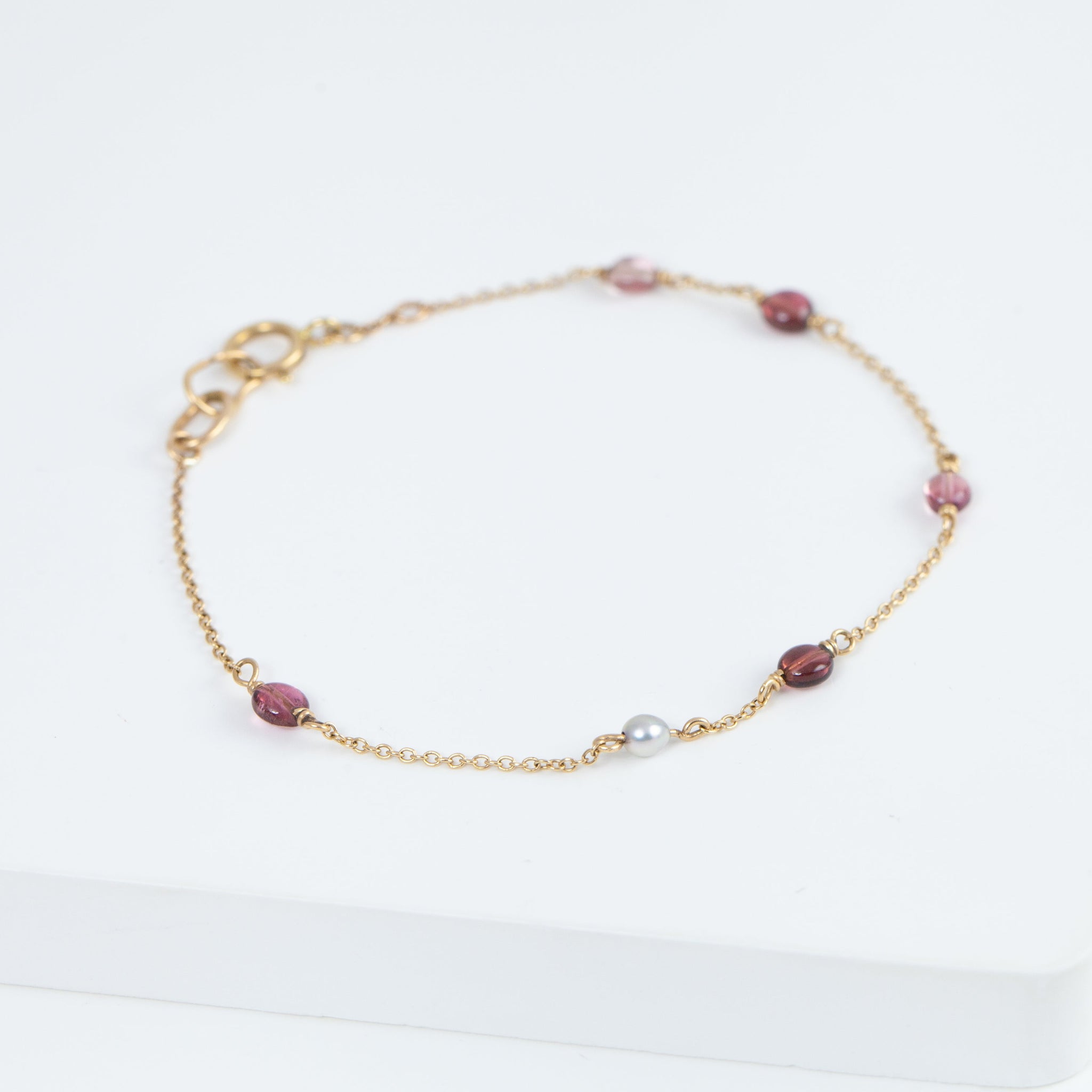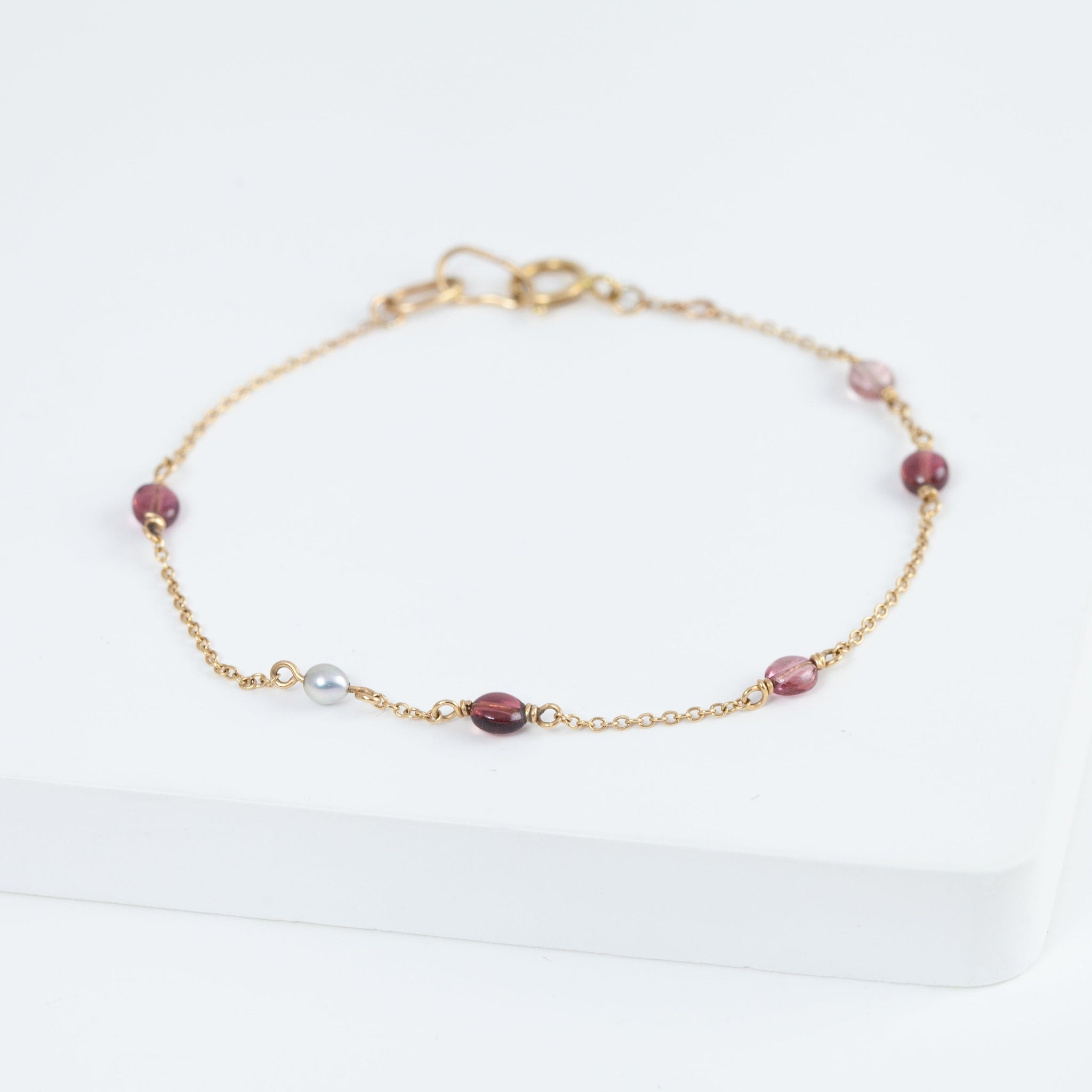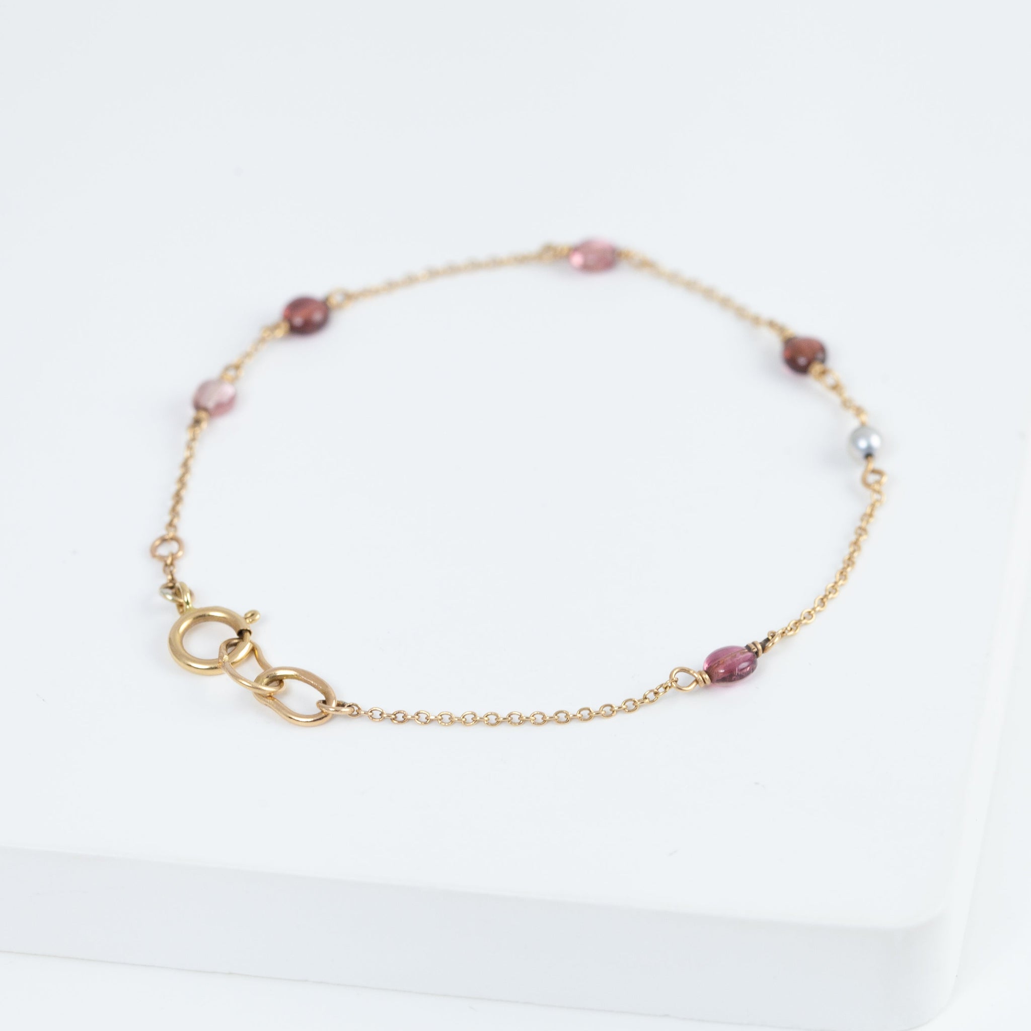 14k gold bracelet with a mixed of different smaller semi-precious stones. Inspired by the nature, occasionally sweet pieces are often in organic shapes.