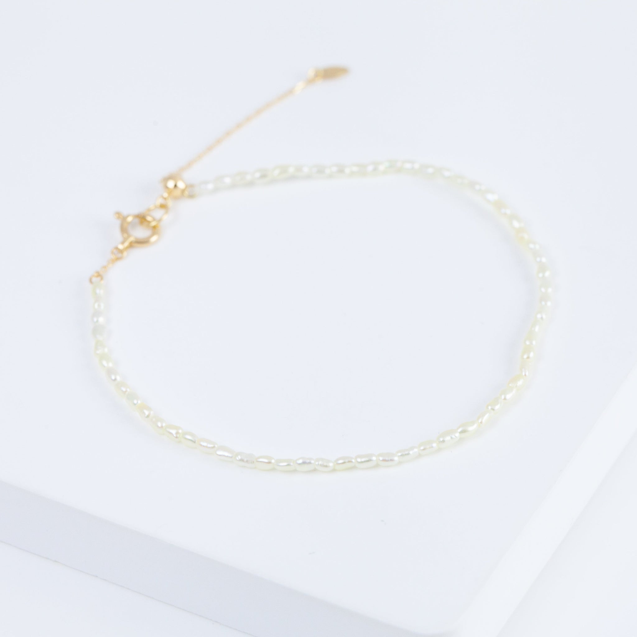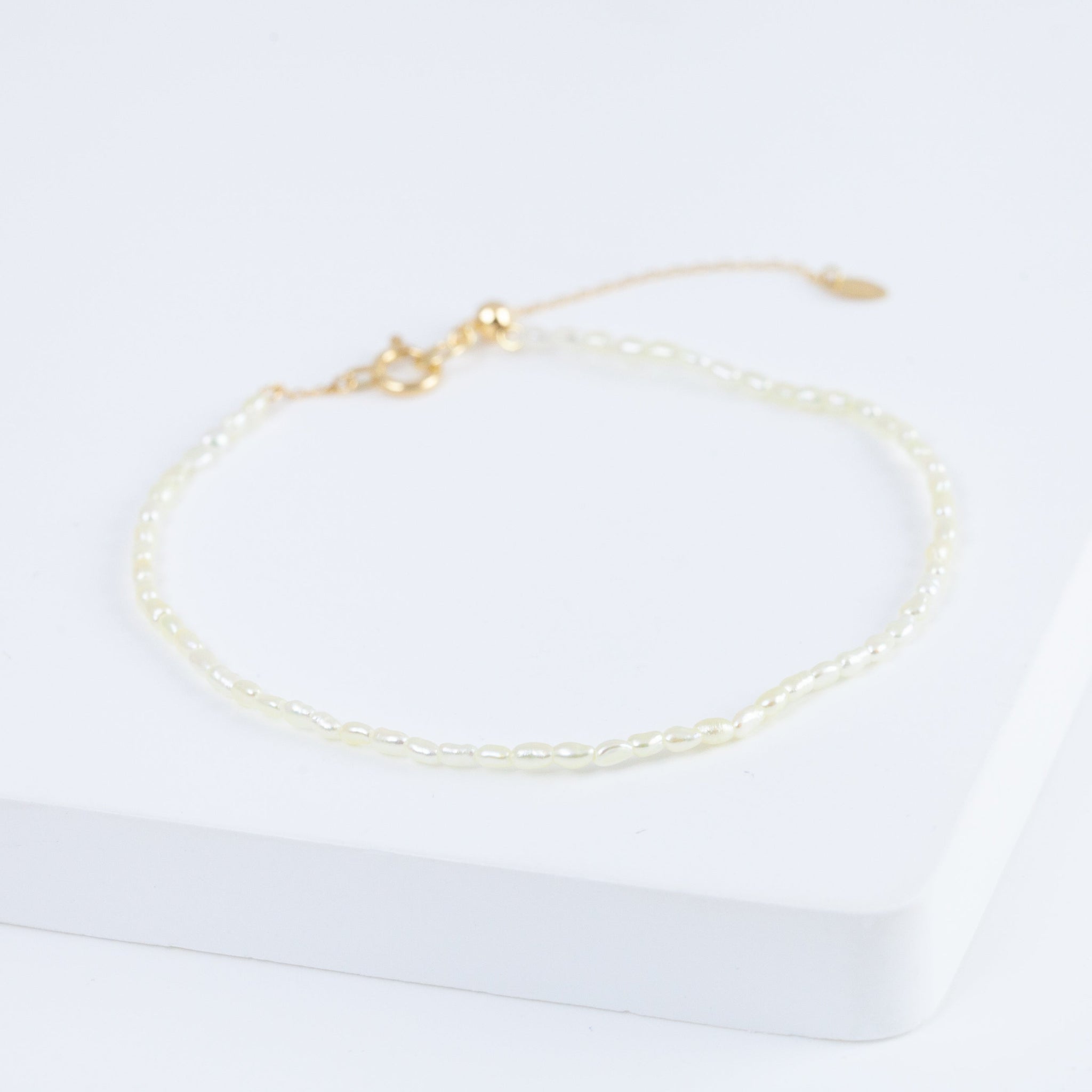 One-of-a-kind small cream colored baby Akoya pearls bracelet with 18K yellow gold hardware. Each Akoya pearl is unique in shape and color, making each bracelet one-of-a-kind. The bracelet has a slider clasp for you to adjust the length easily without any compromising on its design.