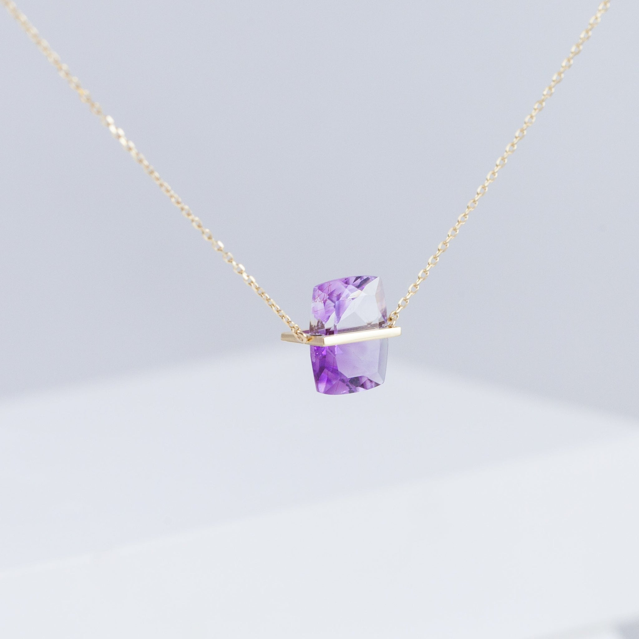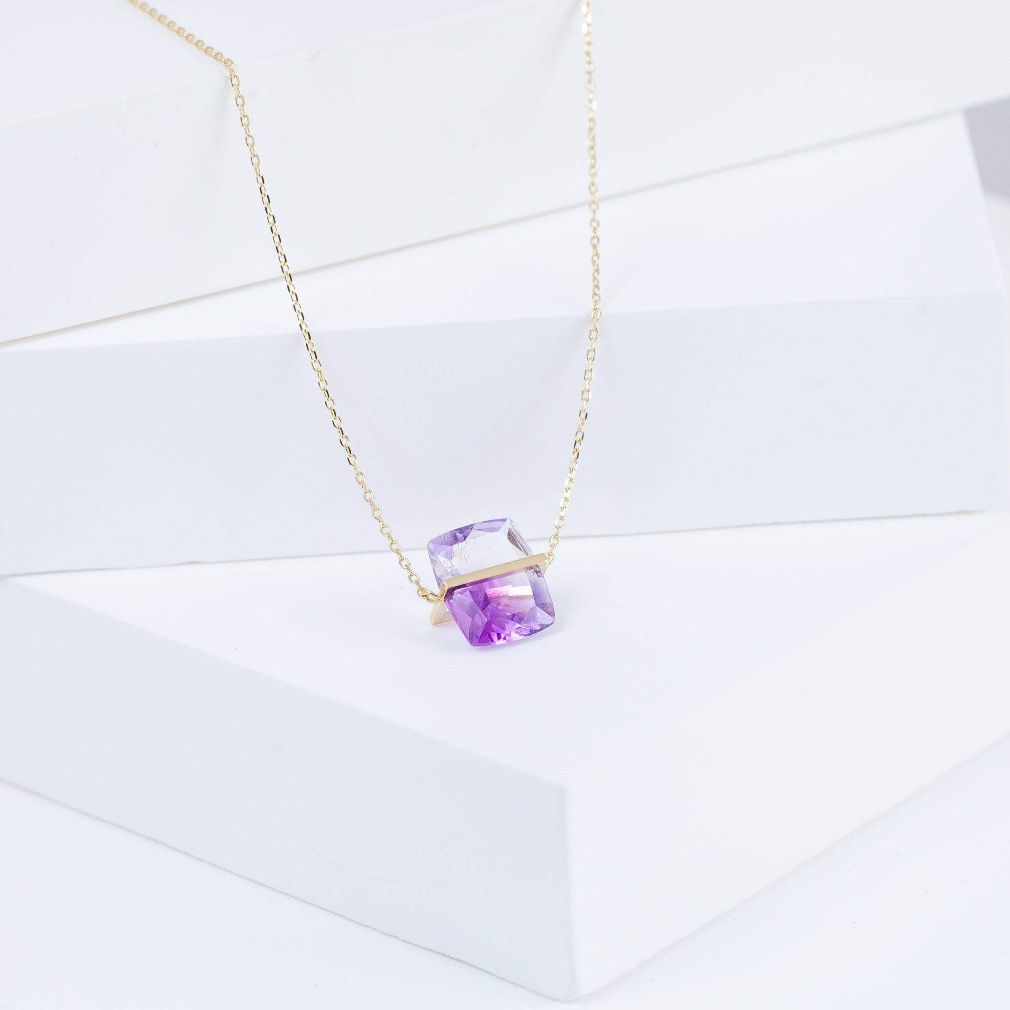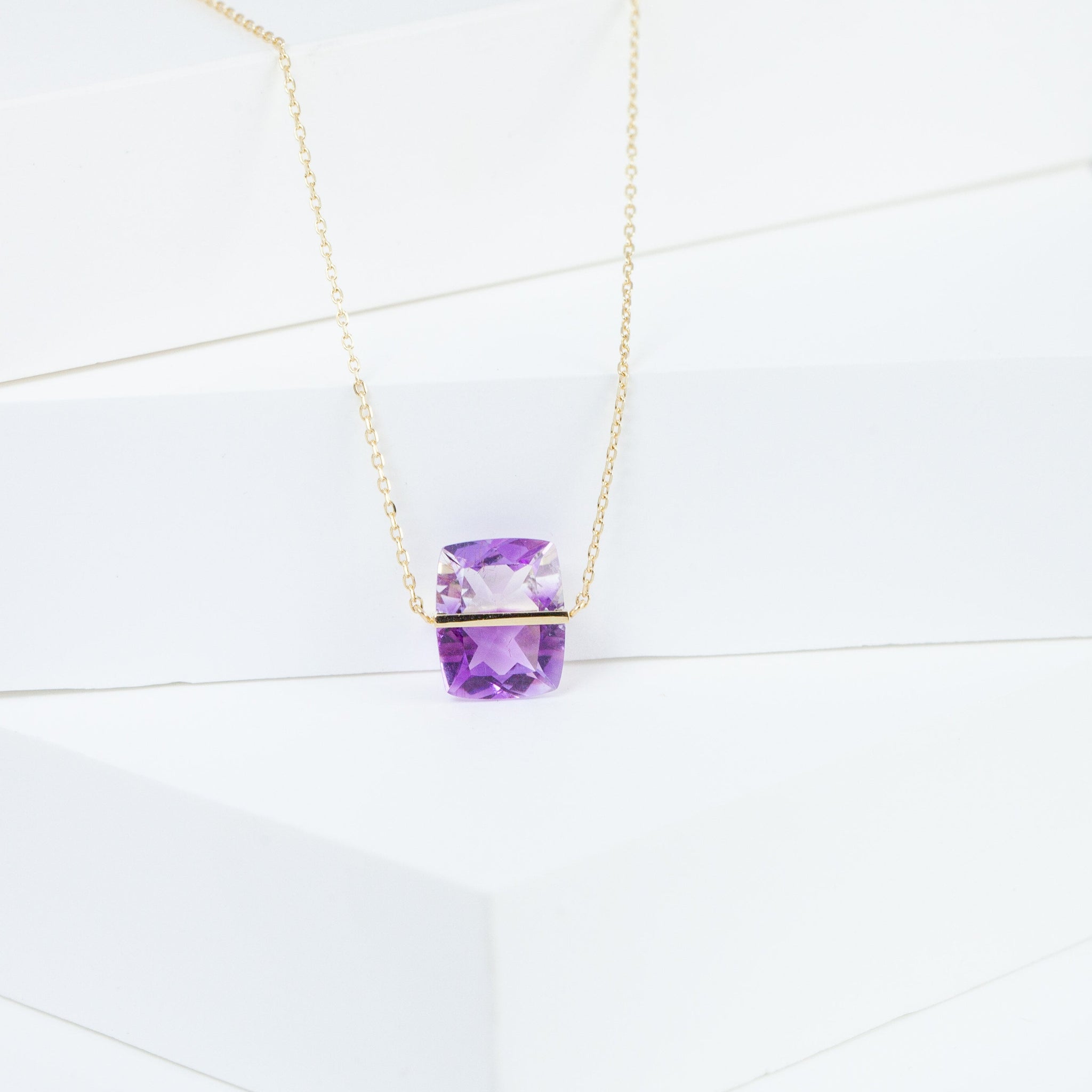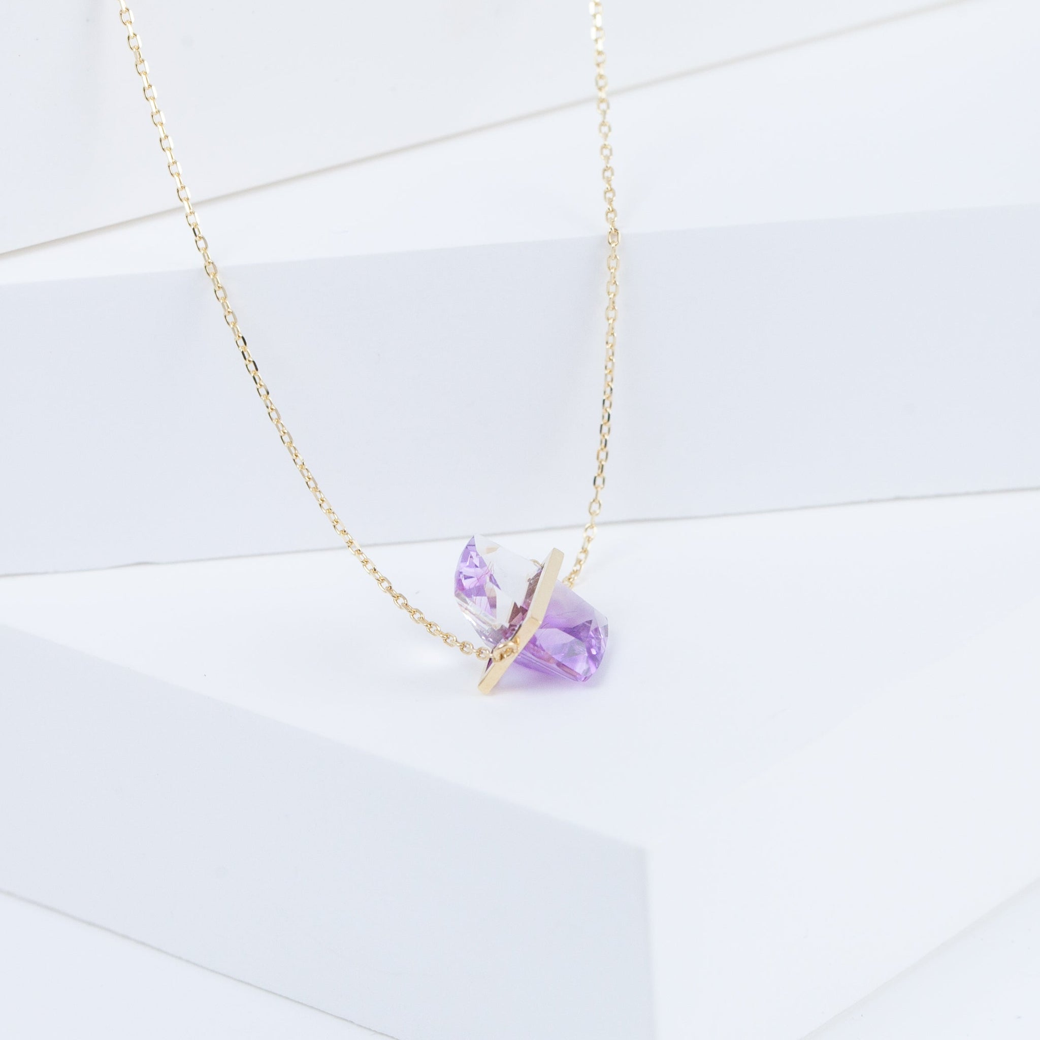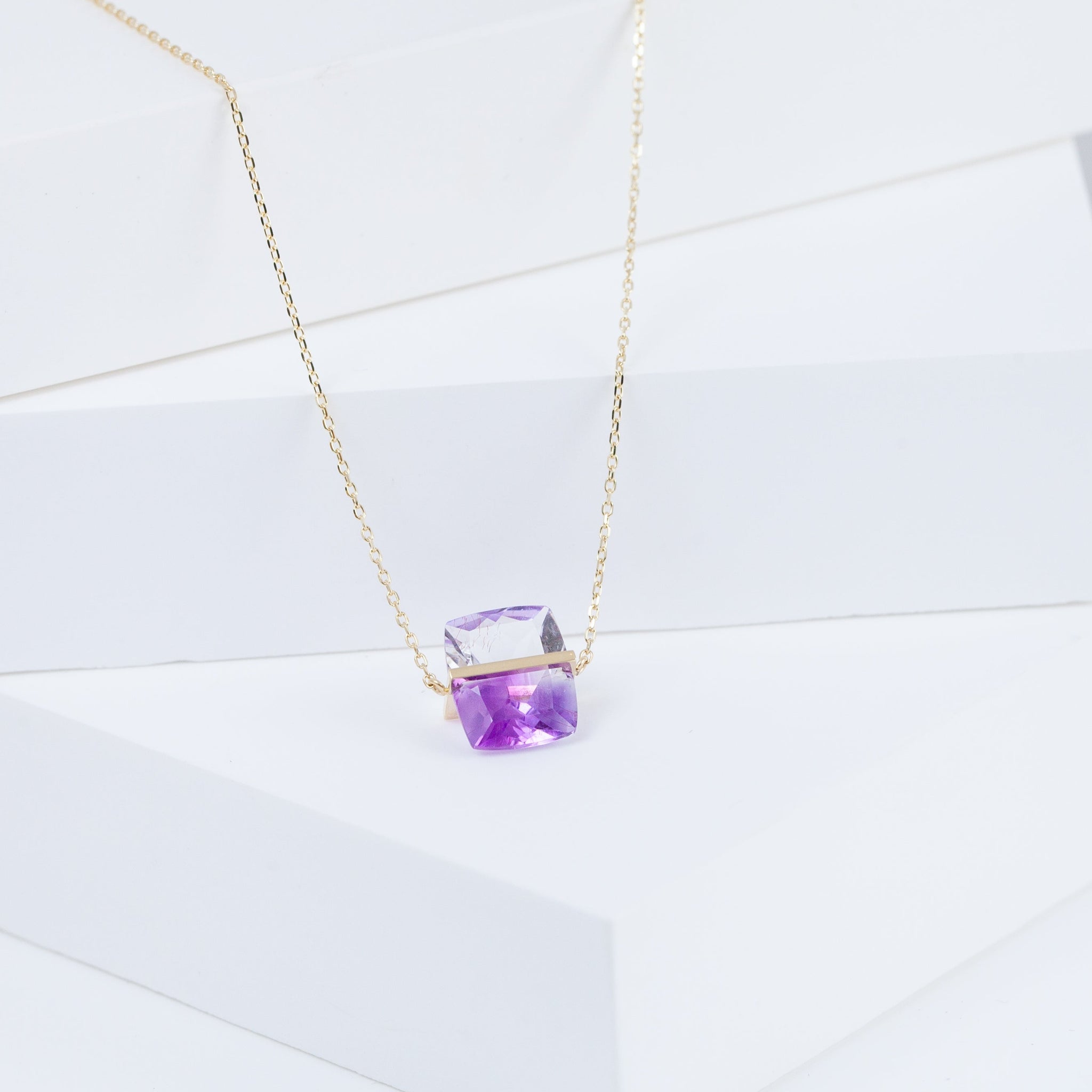 10k yellow gold bi-color amethyst necklace. This necklace has a silicon adjuster at the back which allows you to shorten it to the length you desire to fit your look of the day.
