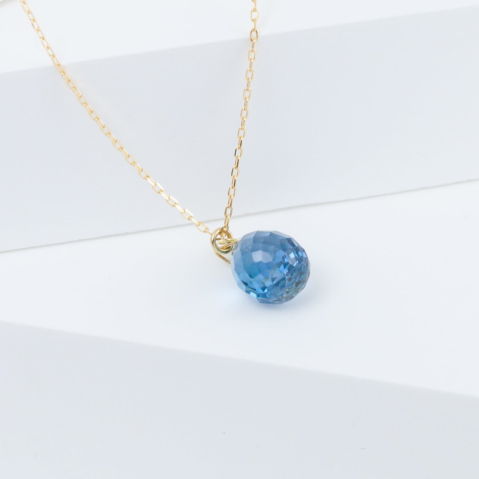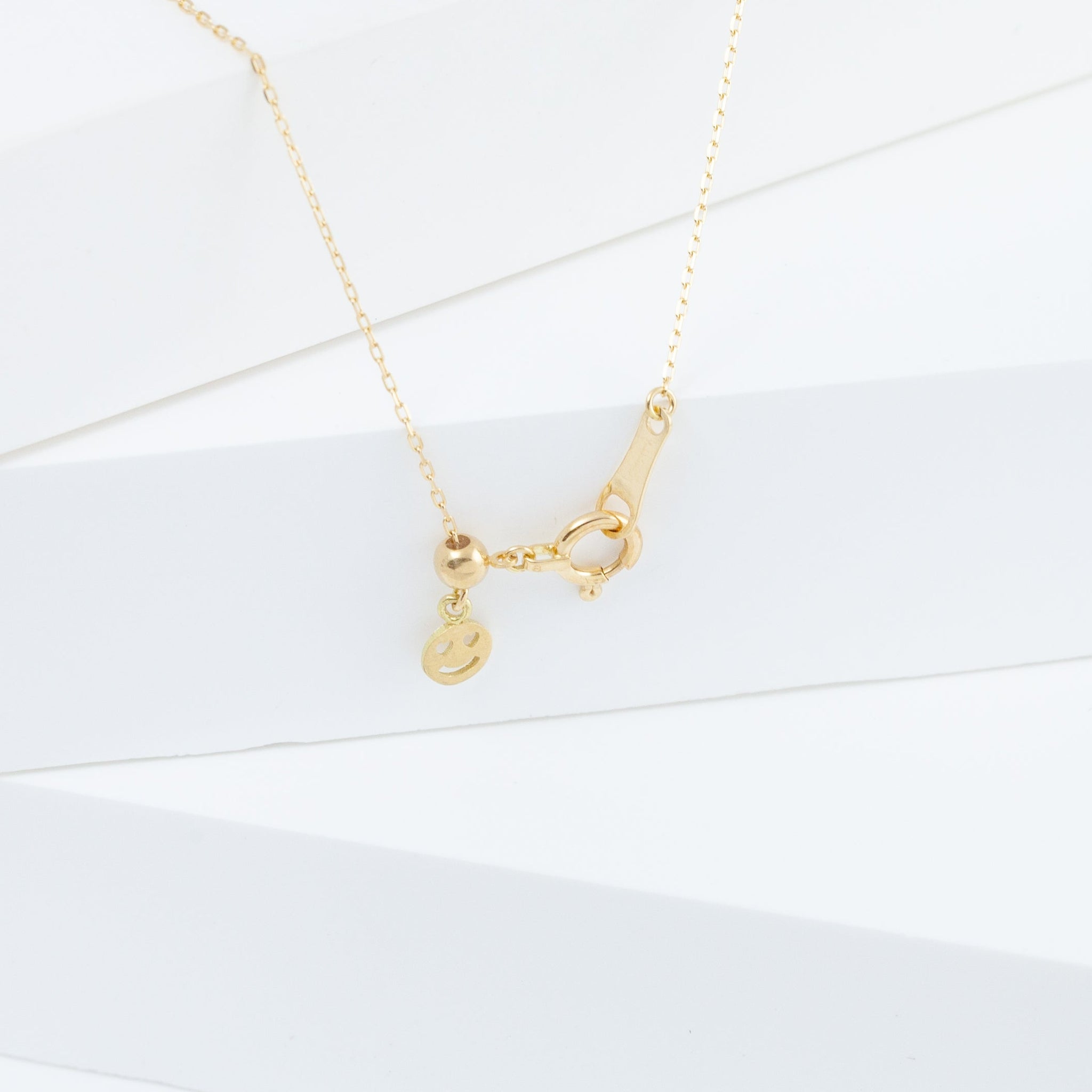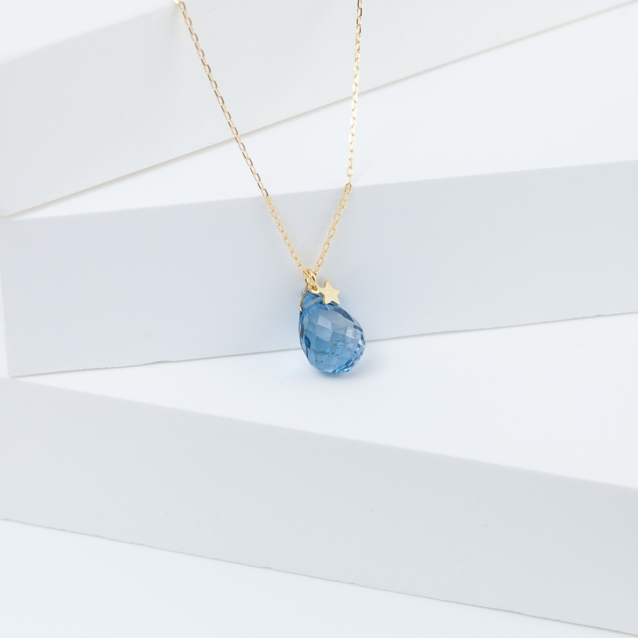 18K yellow gold necklace with briolette London Blue Topaz and a smiley face charm dangling in the back. A smiley face dangles from the clasp so this necklace does not turn as easily, while adding a smile to your back silhouette.