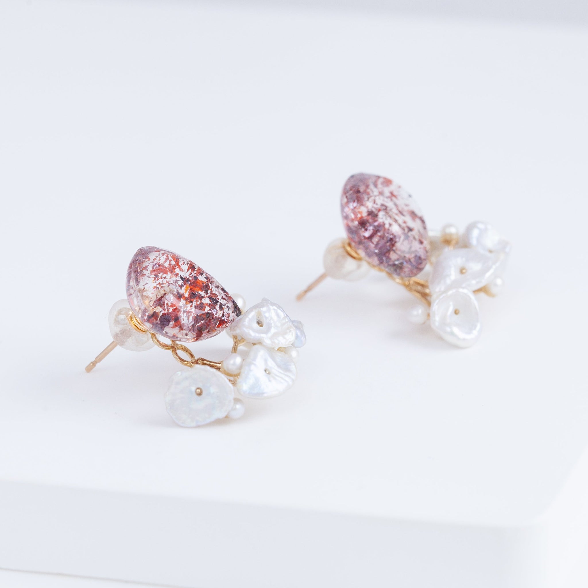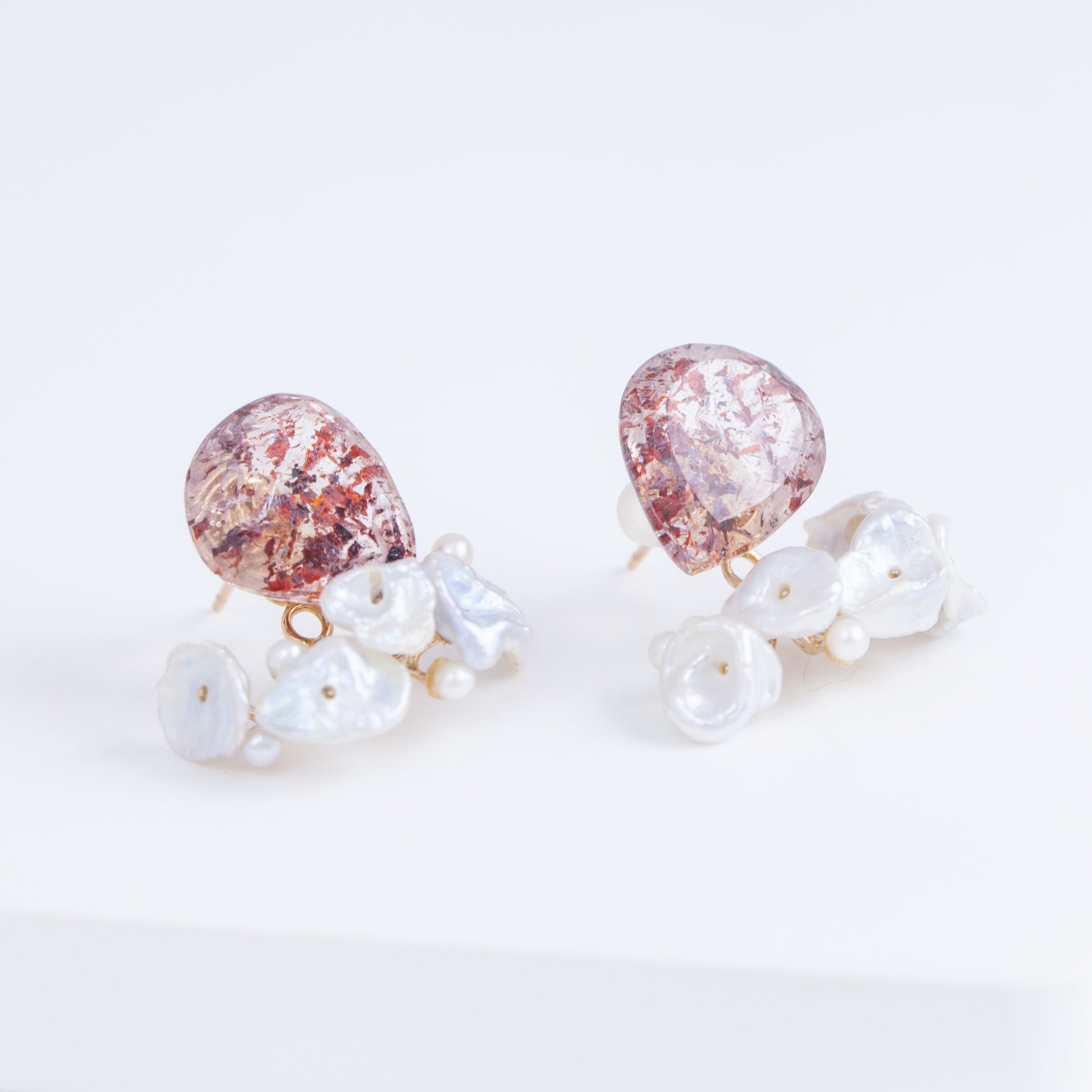Bohem's signature fairy earrings with lepidocrocite in quartz as the main stone, and a mix of baroque and round freshwater pearls on the hugger. Every lepidocrocite in quartz stone is unique with its own natural pattern. This pair reminds me of a summer party with confetti and bowls kiwis and strawberries.