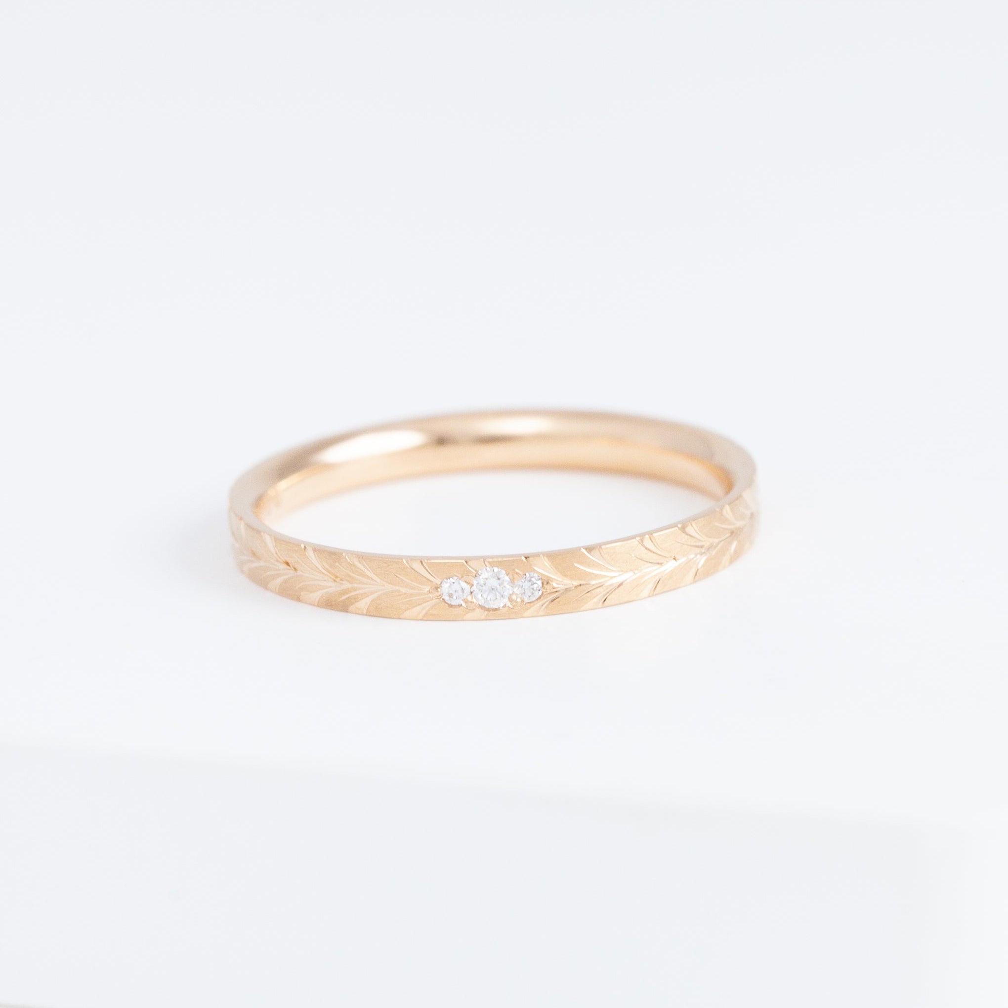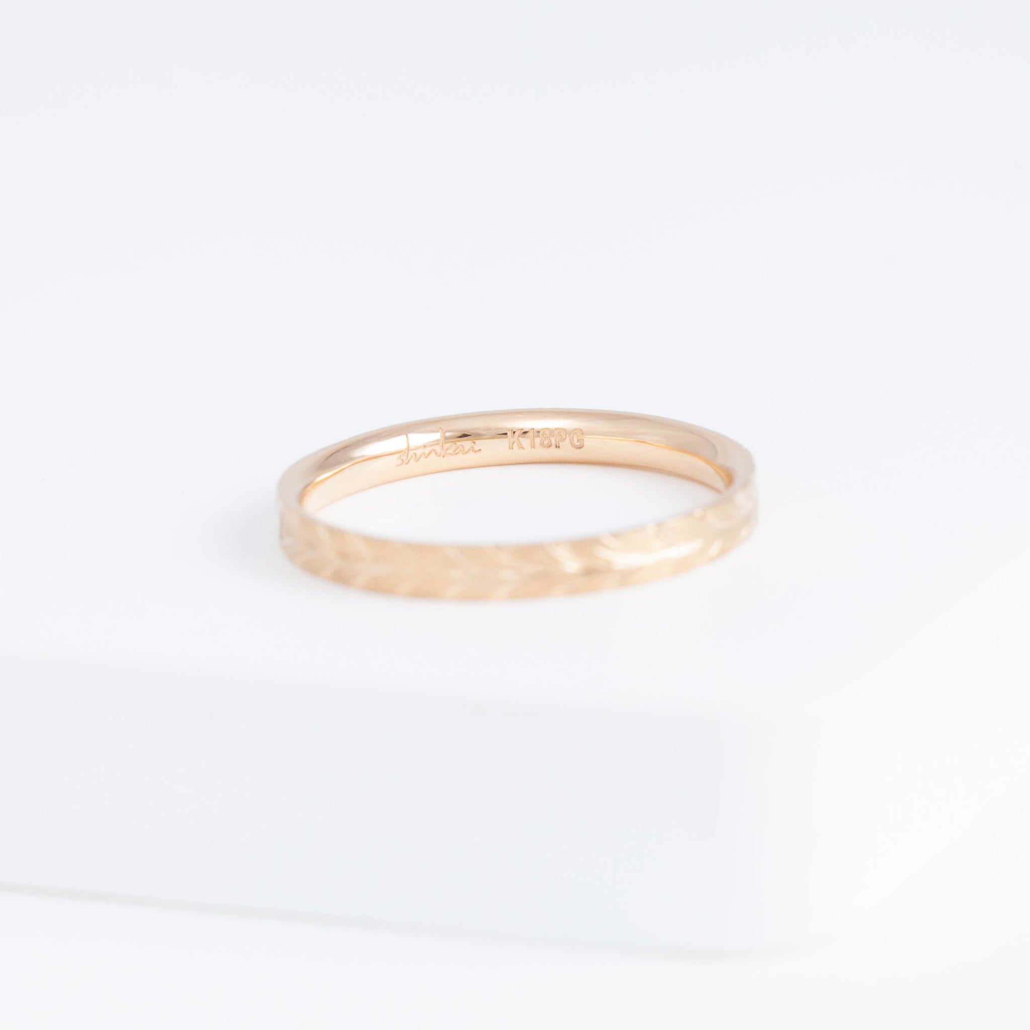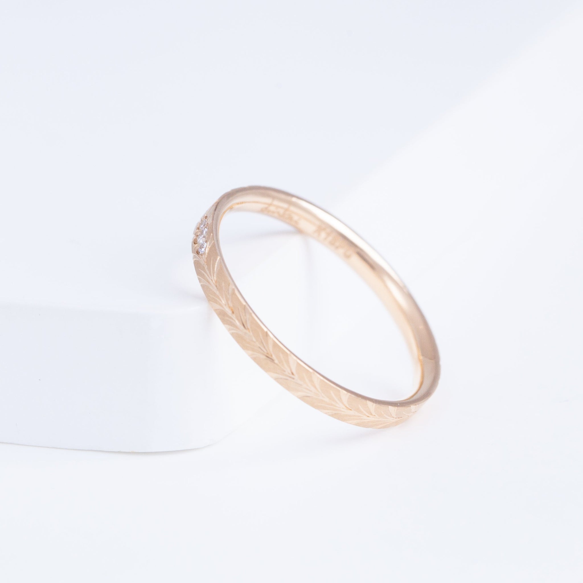 The Laurel collection gets its name by the tactfully hand-engraved bay leaf motif around the ring. The bay leaf is a symbol that has long been used in wedding bands to celebrate lasting commitment. Rooted in such traditional, Shinkai hopes this band carries the blessings for your new beginnings as well.