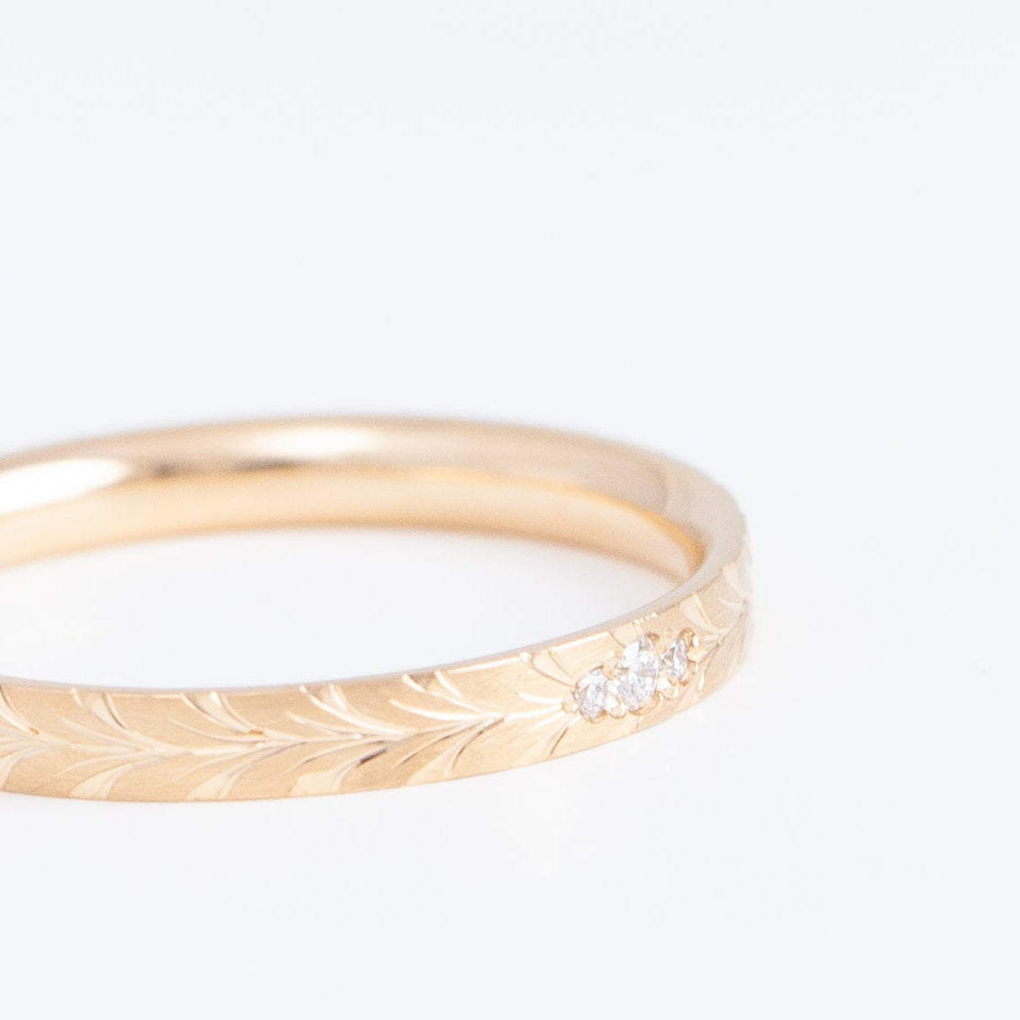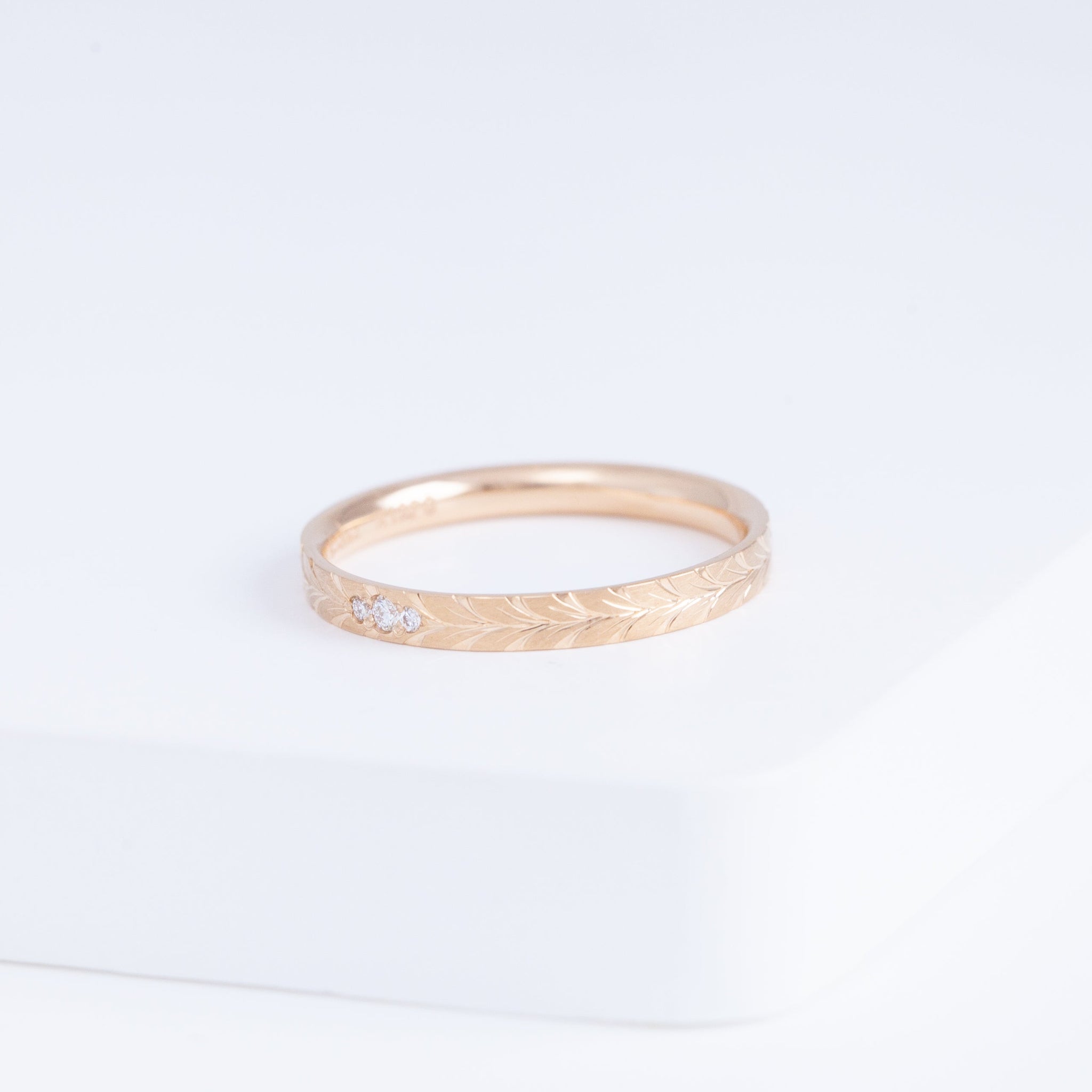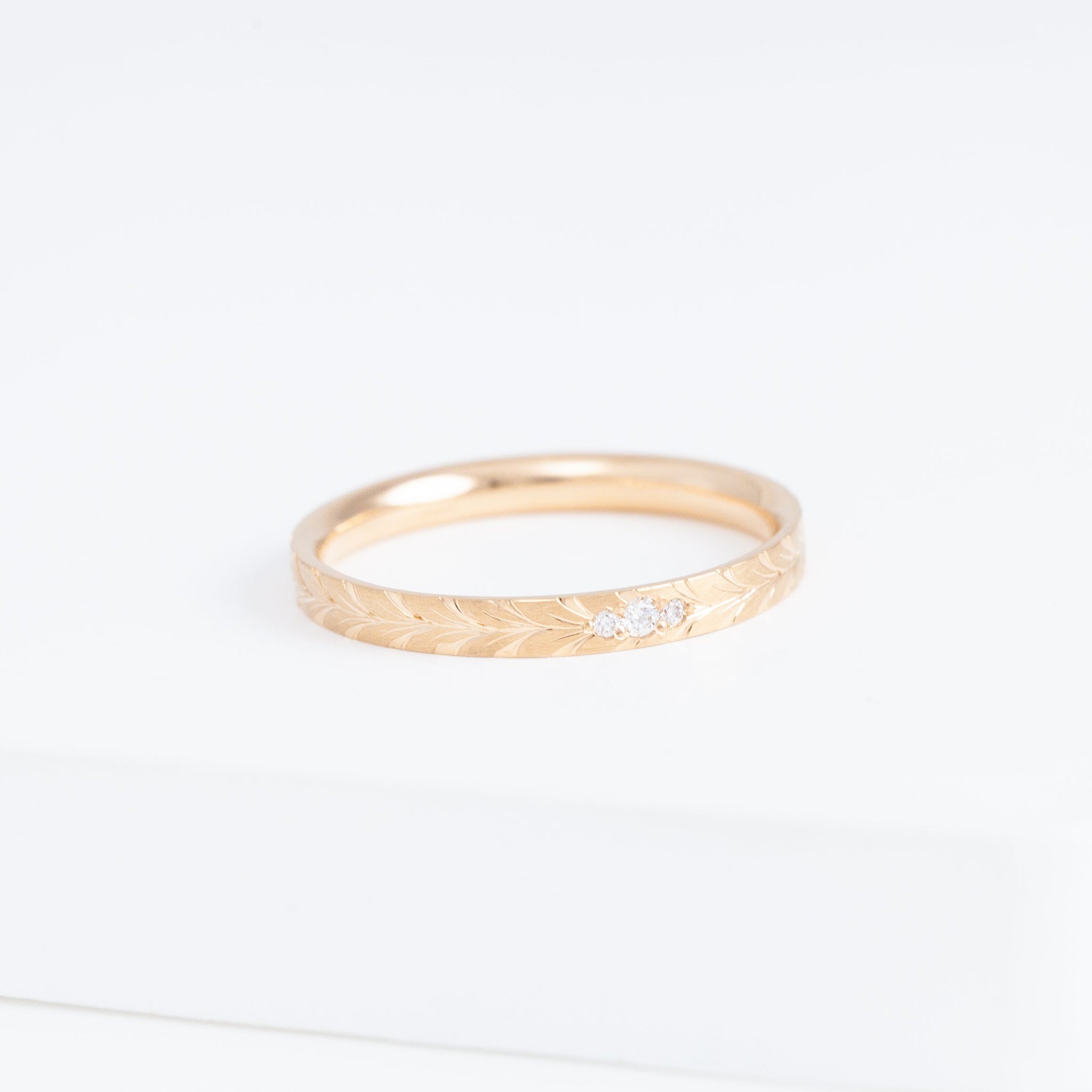 The Laurel collection gets its name by the tactfully hand-engraved bay leaf motif around the ring. The bay leaf is a symbol that has long been used in wedding bands to celebrate lasting commitment. Rooted in such traditional, Shinkai hopes this band carries the blessings for your new beginnings as well.