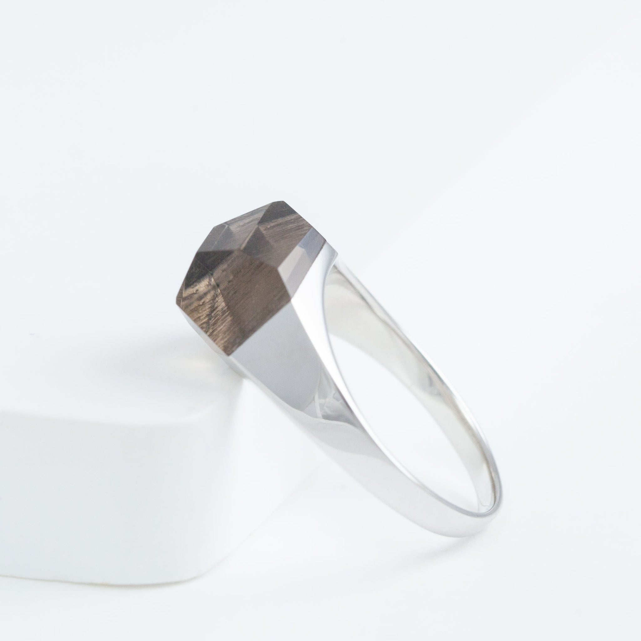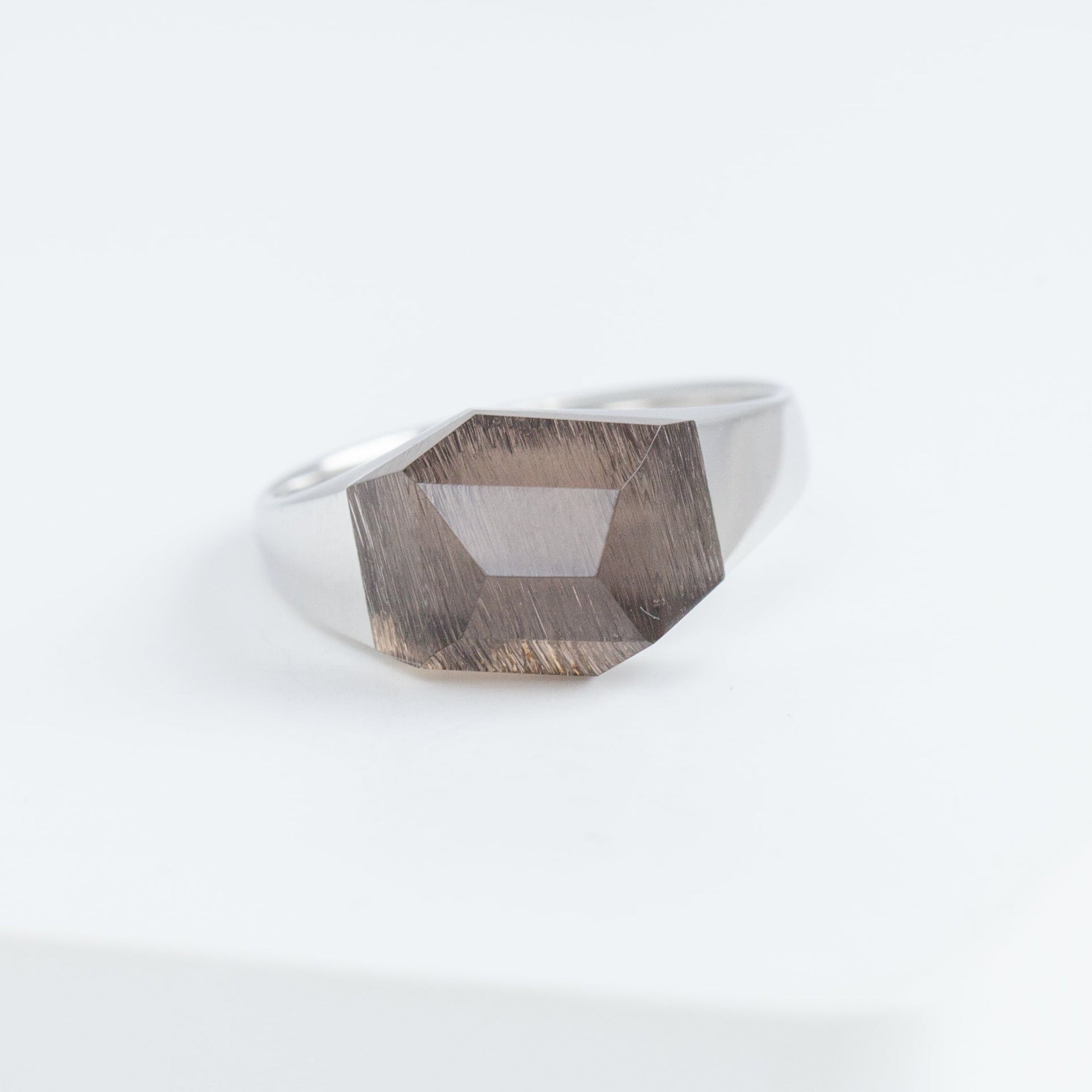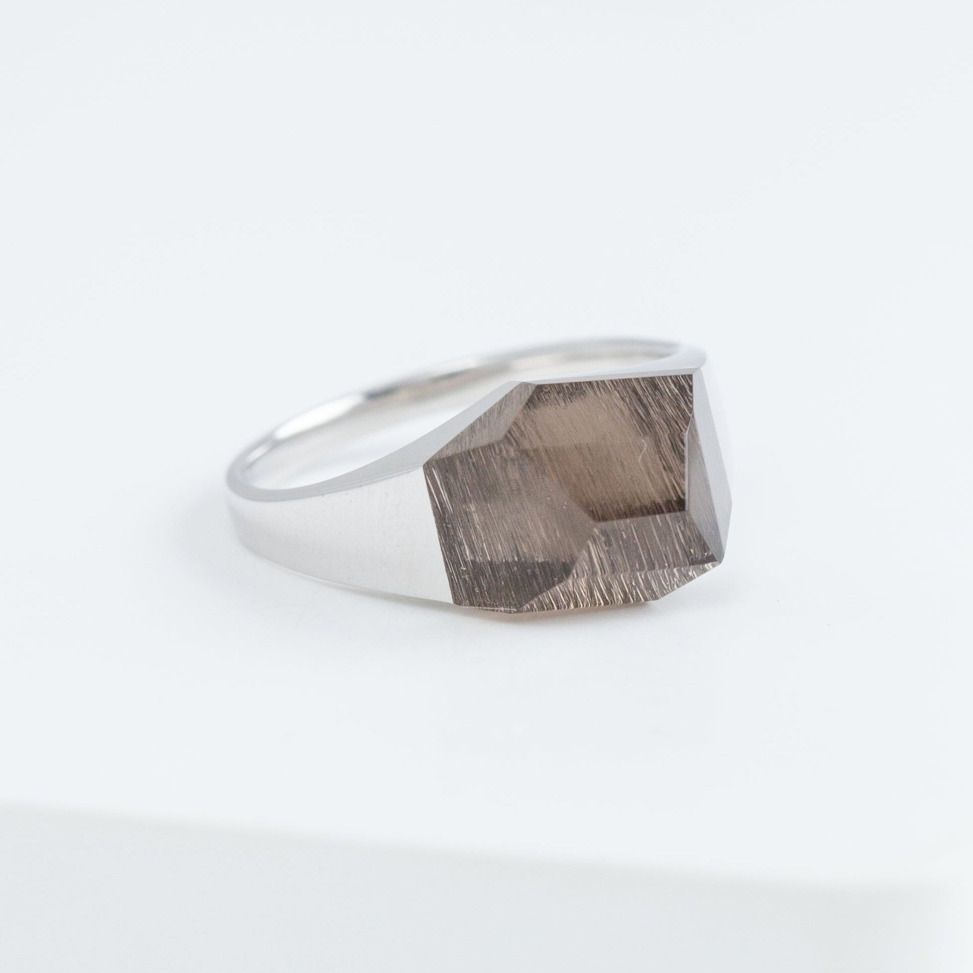 Bororo's signature rock ring in a smaller size with a beautiful smoky quartz stone from Brazil. Mini rock rings are perfect for those who love the innovative design of rock rings and want to wear it every day. The irregular geometrical cut of the stone makes this ring edgy and contemporary.