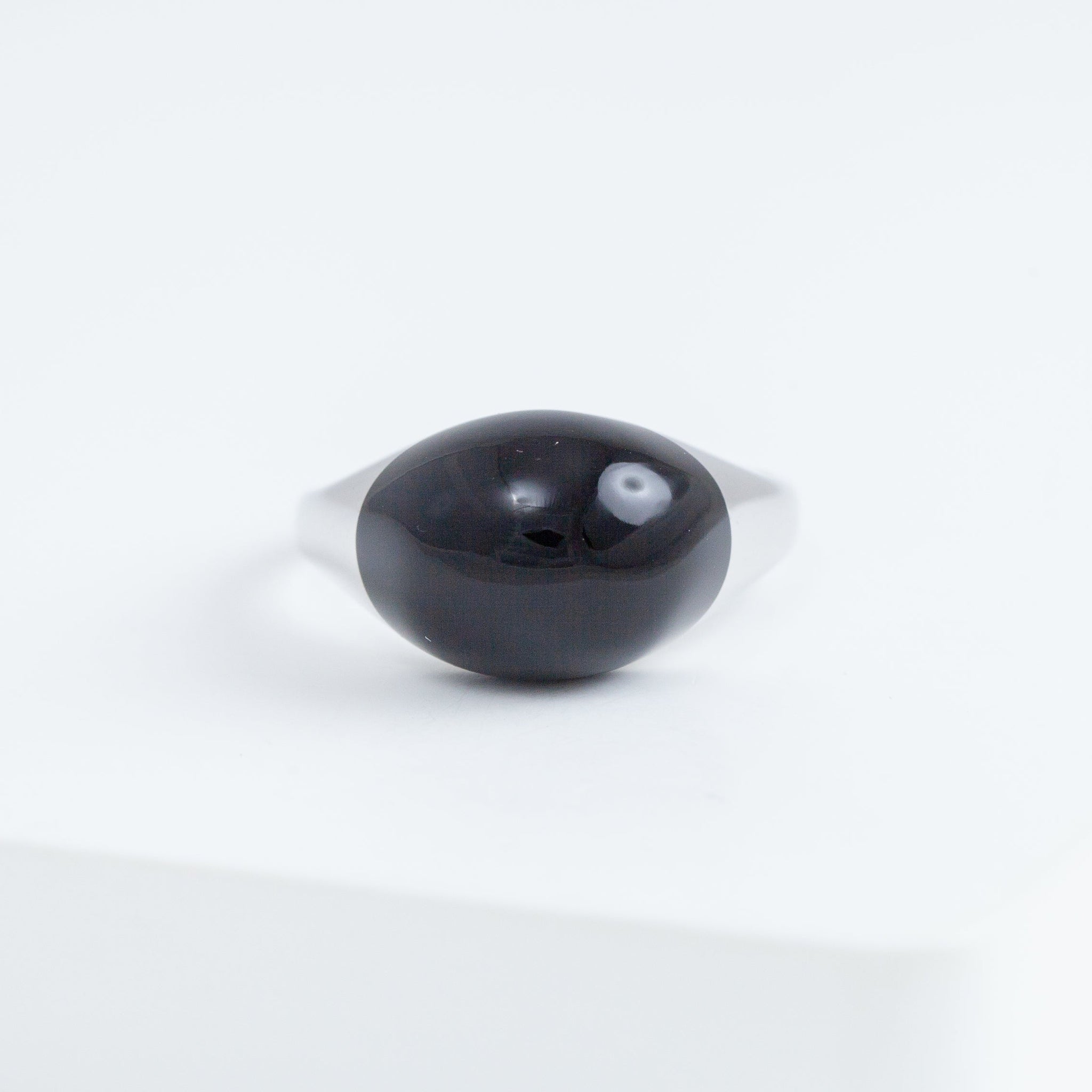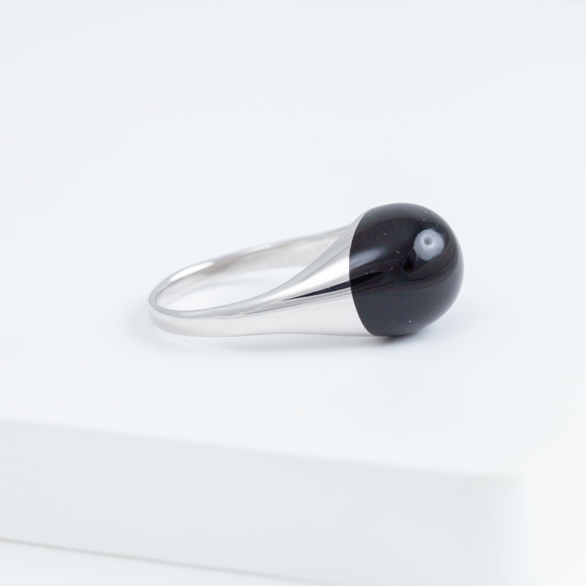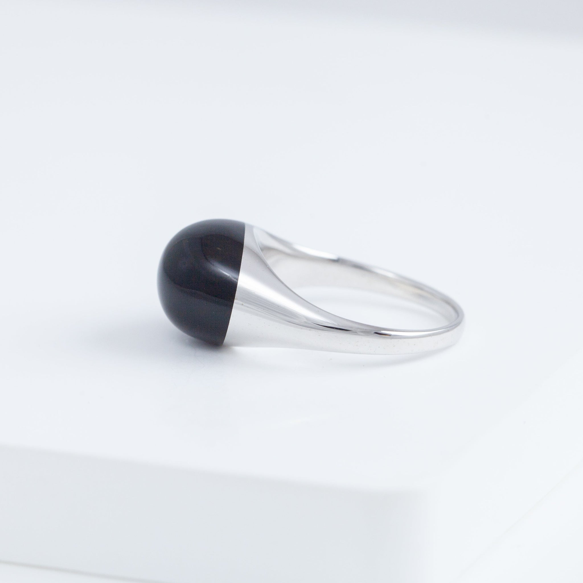 Bororo's signature rock ring in a smaller size with a round pitch-black onyx stone. This black onyx ring is as cool as you can imagine, and as elegant as can be. Mini rock rings are perfect for those who love the innovative design of rock rings and want to wear it every day. This ring is extremely gentle on clothing with its smooth, round-shaped stone.