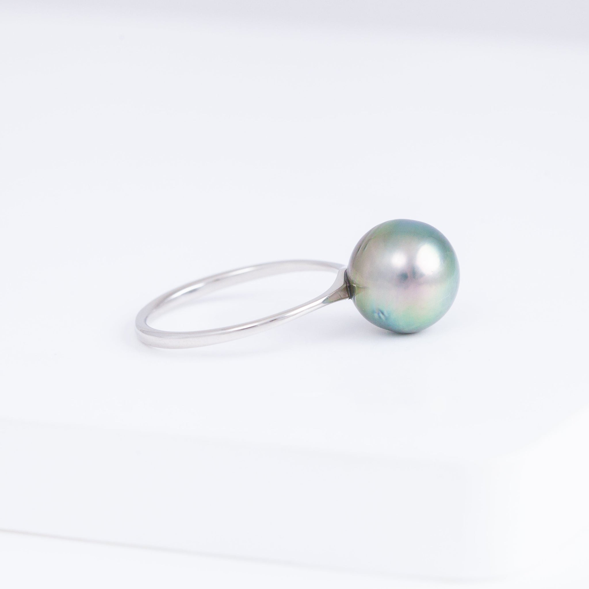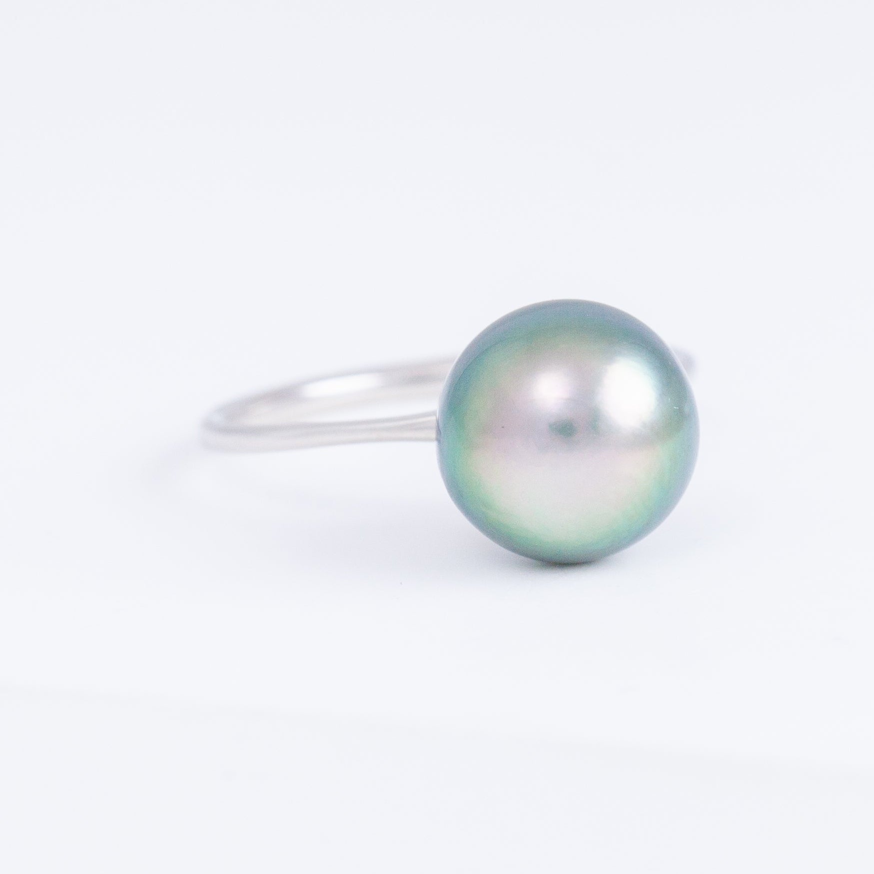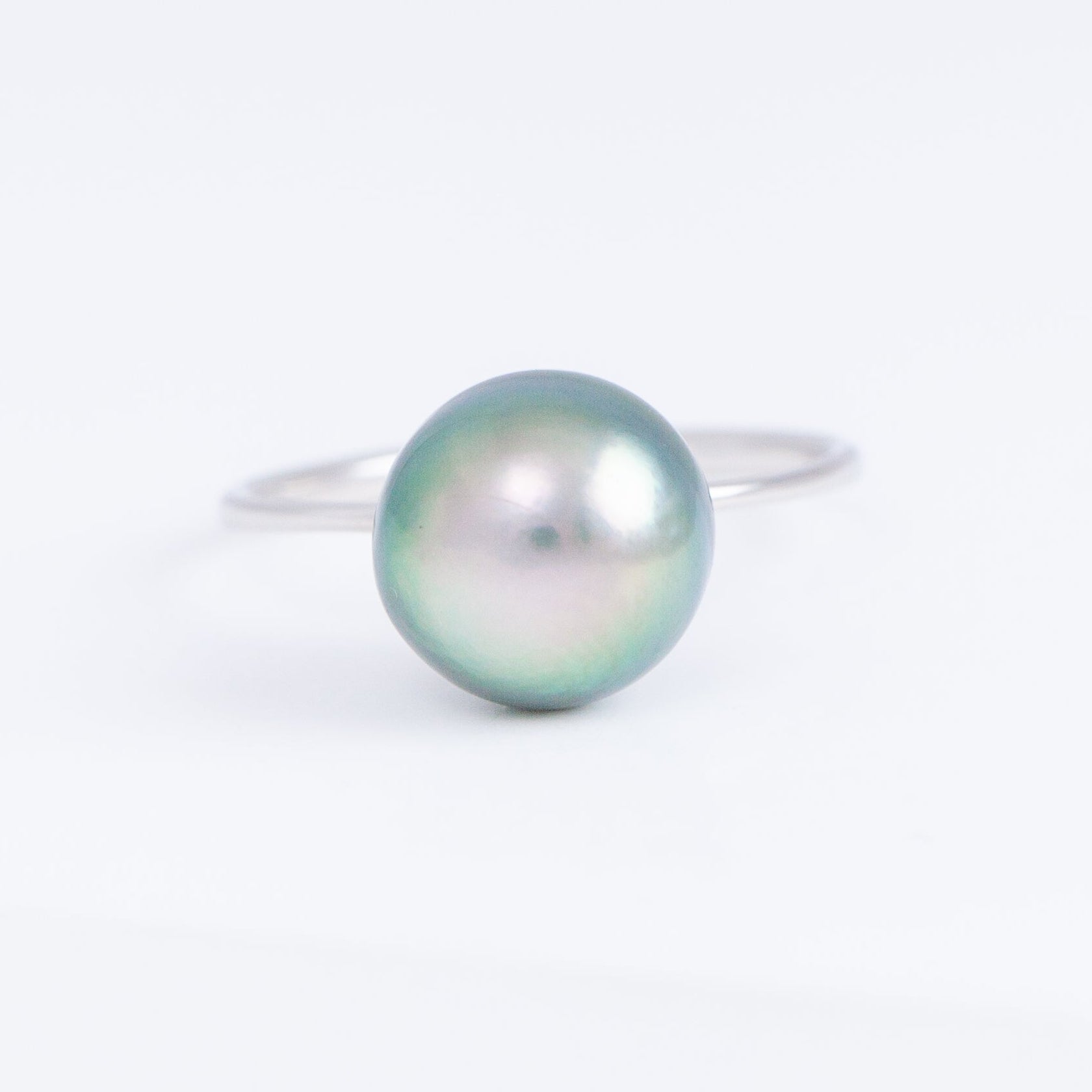 Delicate platinum ring with show stopping Peacock colored south sea pearl. Each pearl is unique in shape and color, making each ring one-of-a-kind. Feel free to contact us to see what pearl we have available!