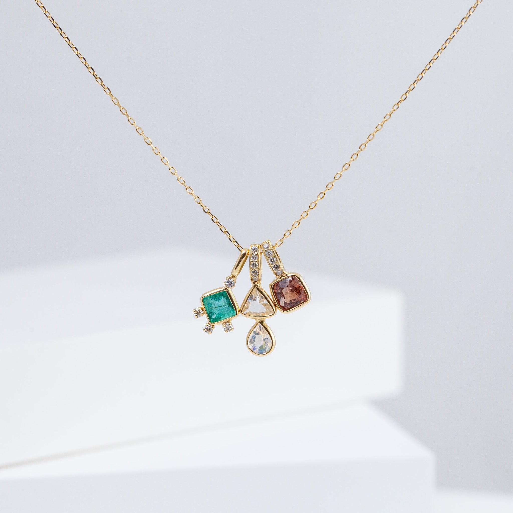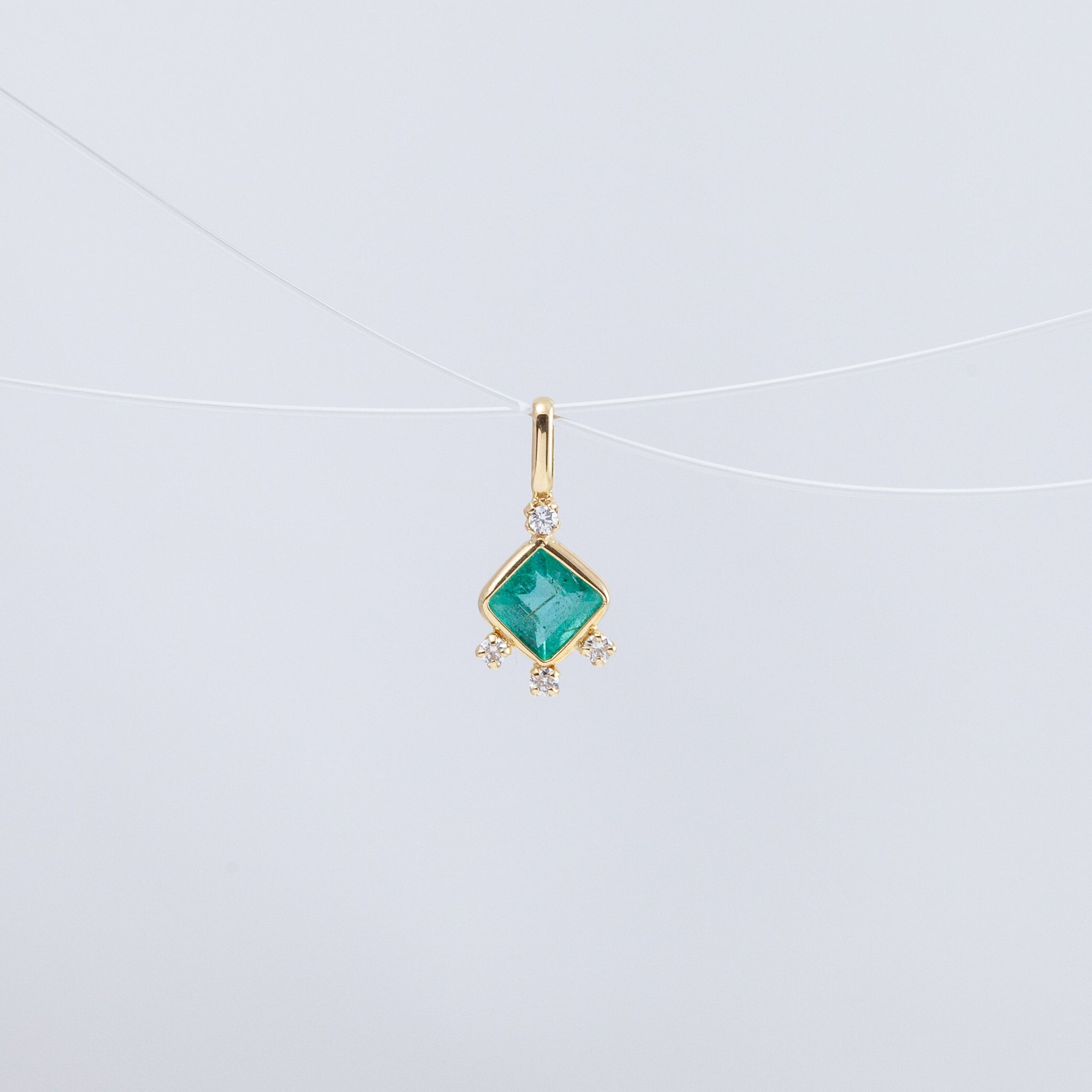 Tiny 18k yellow gold necklace with a gorgeous one-of-a-kind emerald decorated with tiny diamonds. The pendant is detachable from the chain, so wear this pendant alone, stack with other Tiny pendants, or with your favorite necklaces, have fun coordinating your jewelry of the day!